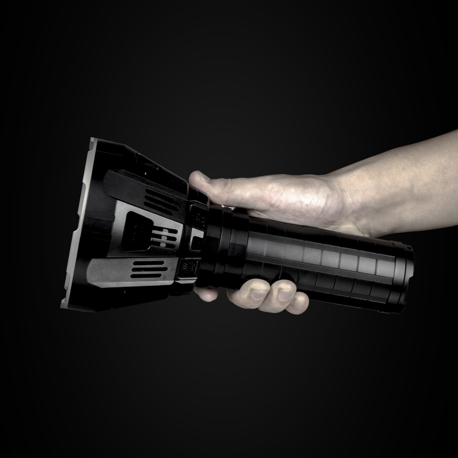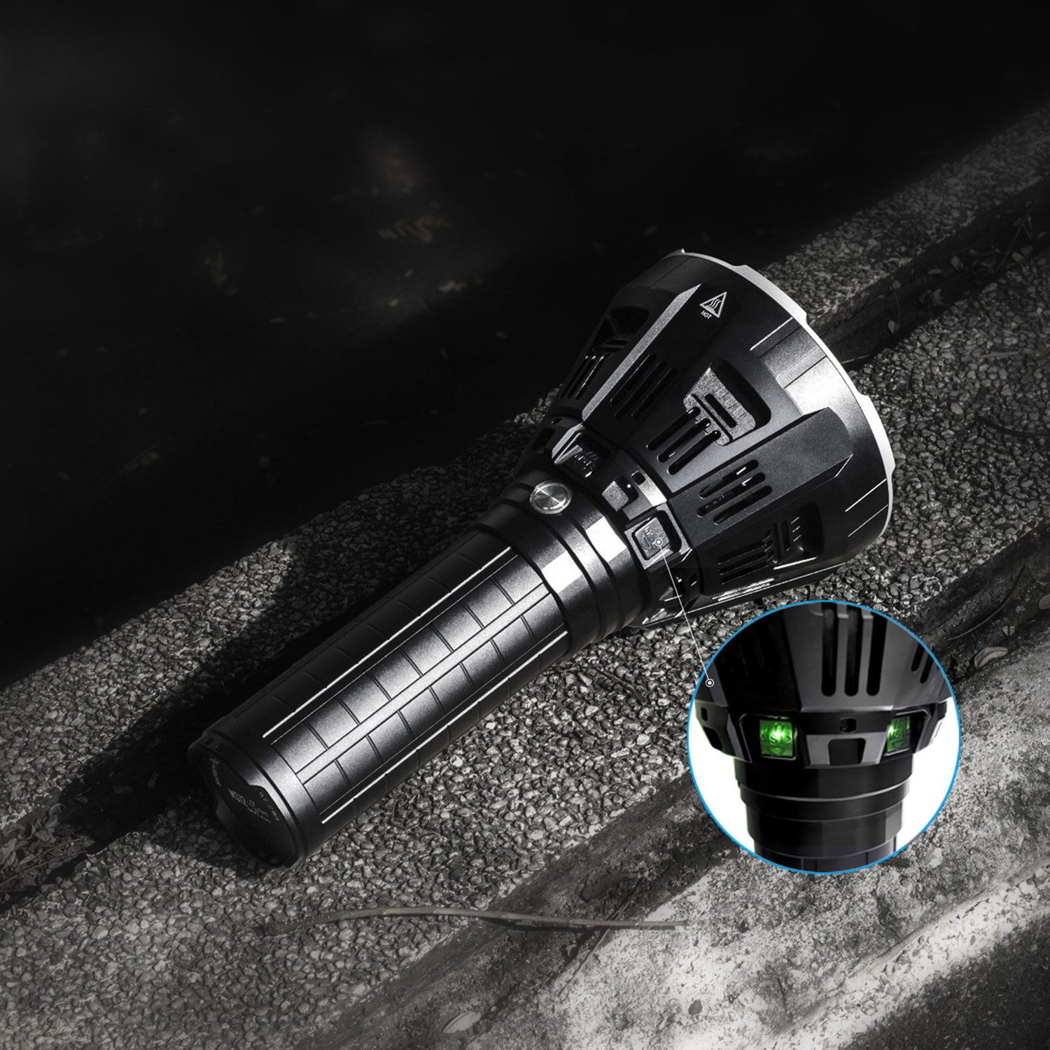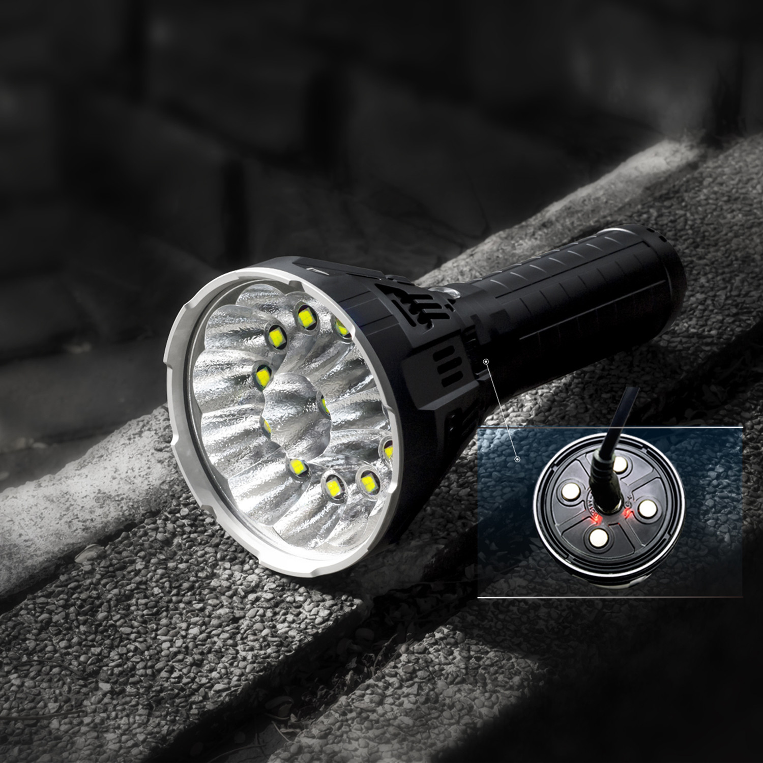 The MS12 used 12 CREE XHP70 LEDs with a maximum output up to 53000LM and long throw up to 913 meters. It's extremely compact and comfortable to hold, and utilizes 6 side lights for camping, fishing and more other outdoor lighting experience!