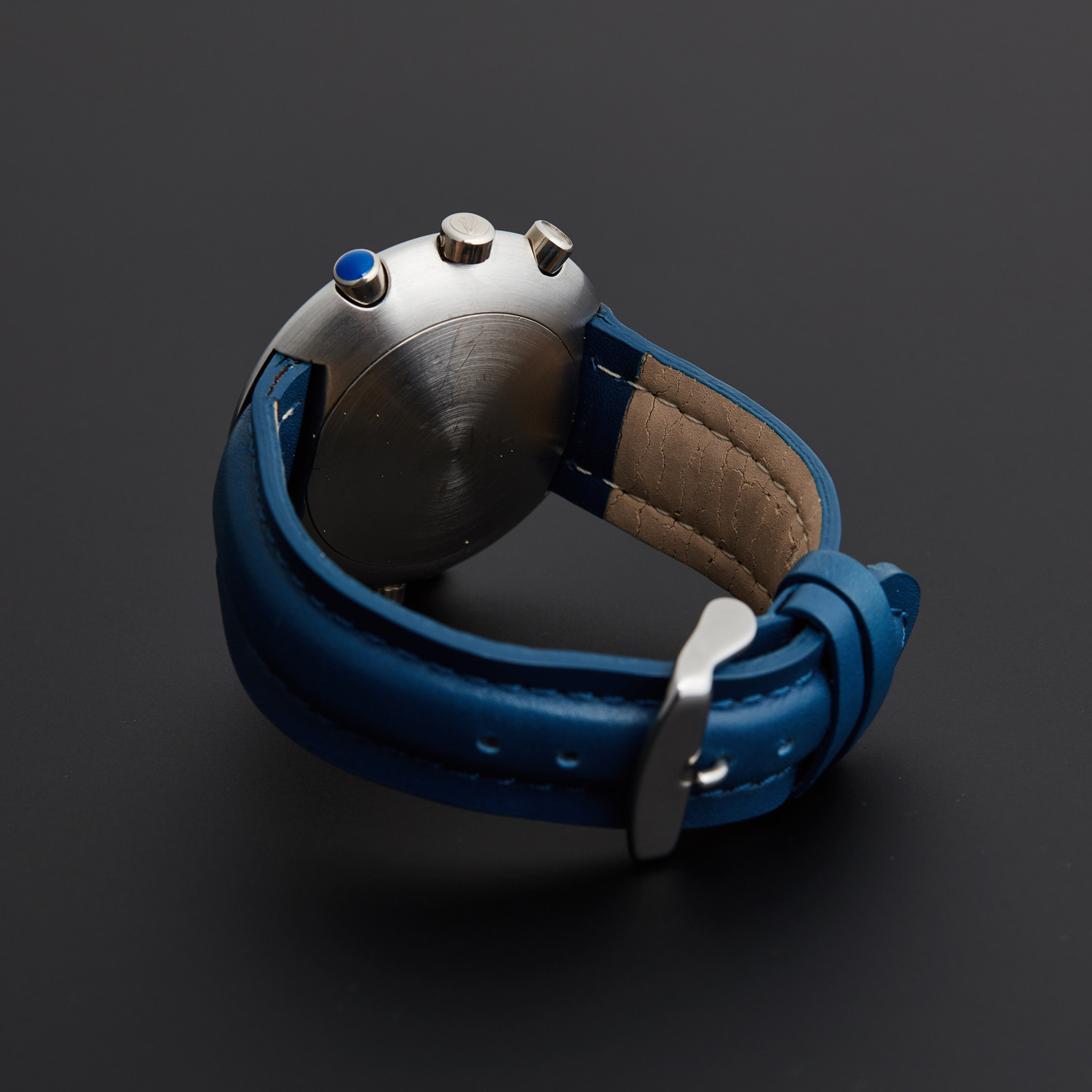 A chronometer made for pilots, the Ikepod Megapode Chronometer Automatic lives up to high standards of precision and construction. Titanium encases its annual calendar, chronometer function, and automatic movement, all on a luxe leather band.