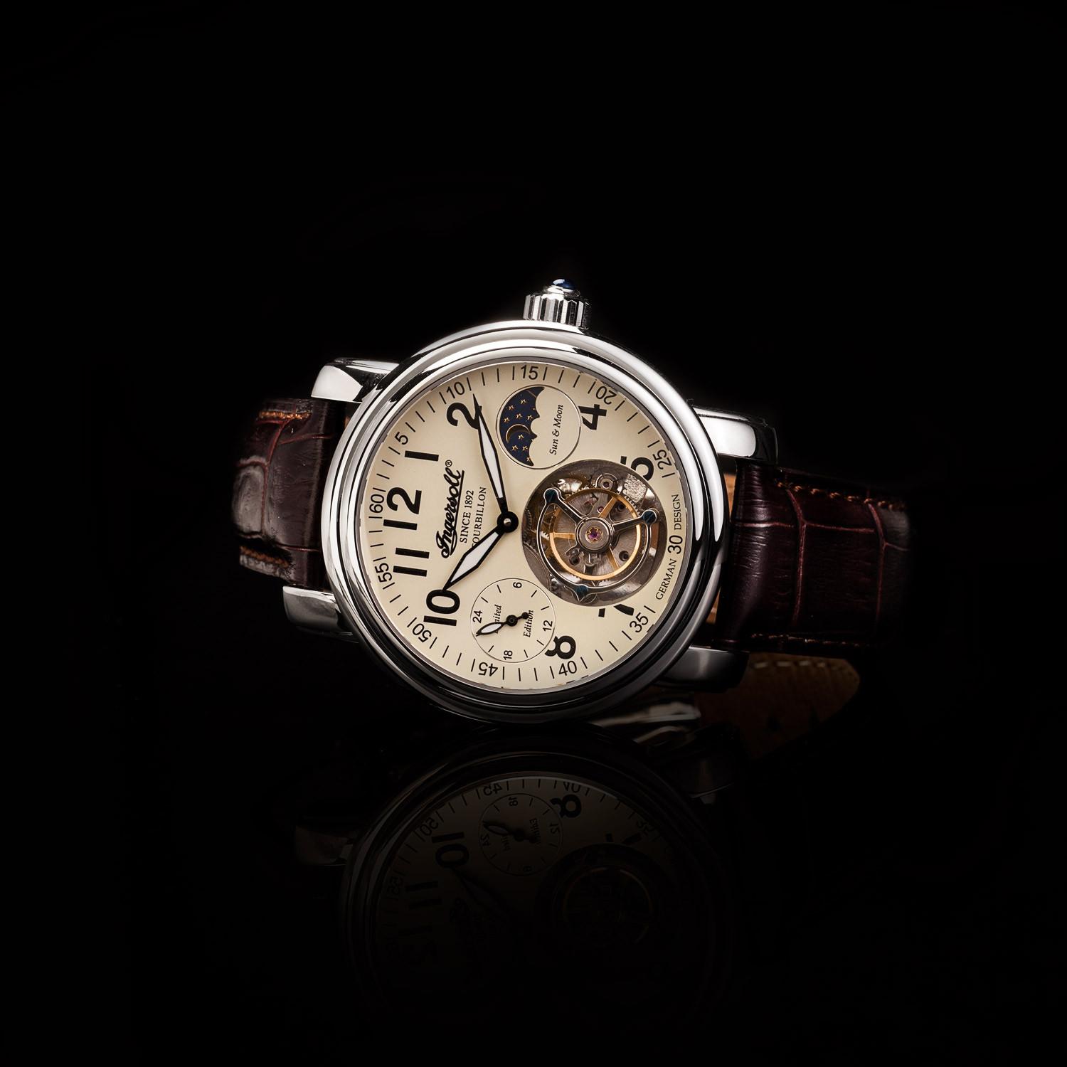 Don't worry, you've got the time. With the tourbillion automatic movement of the Lahota watch in cream, not to mention the 18 jewels, your wrist is host to a wonder. The open wheel balance bar and sun and moon subdials set it apart from the crowd of chronographs that don't compare.