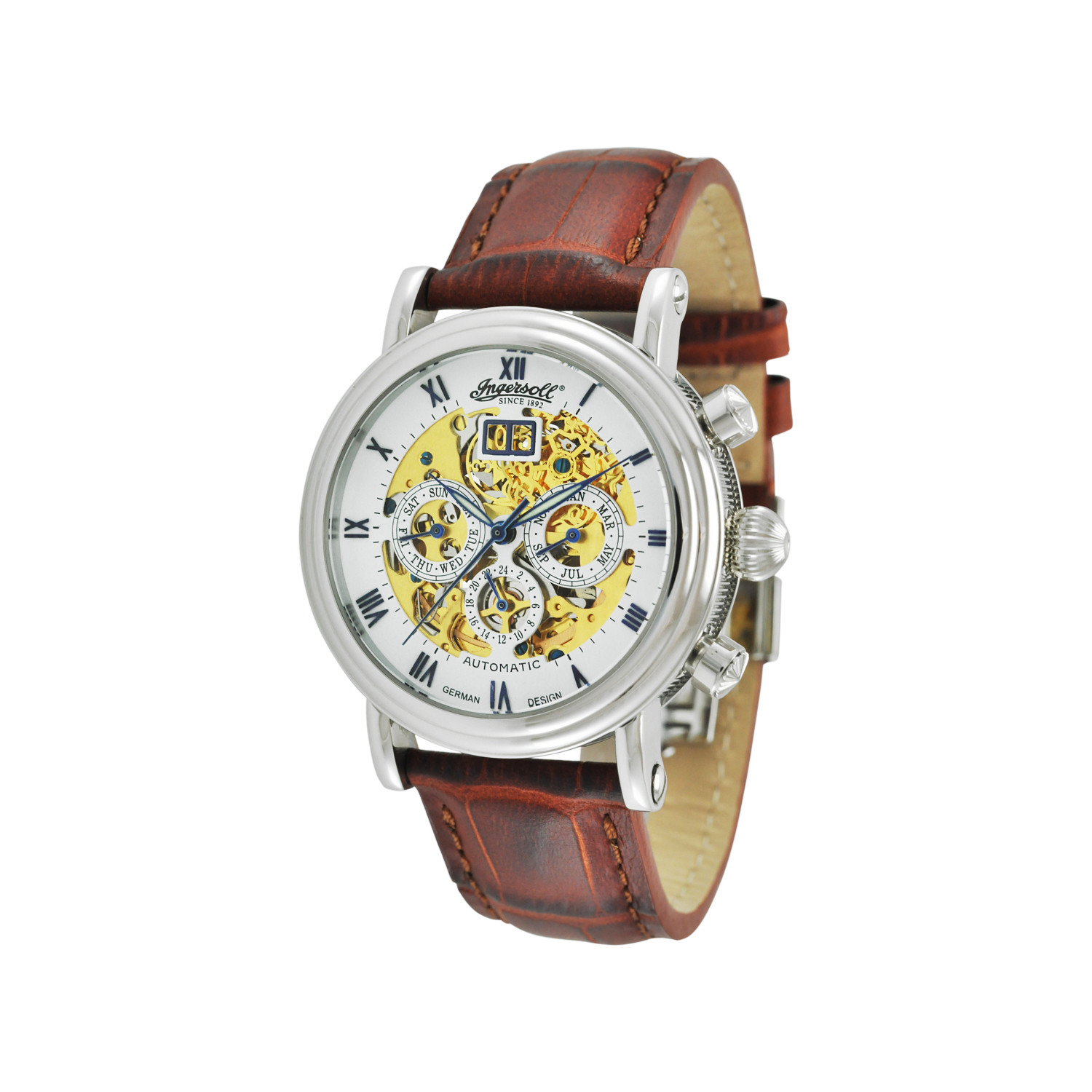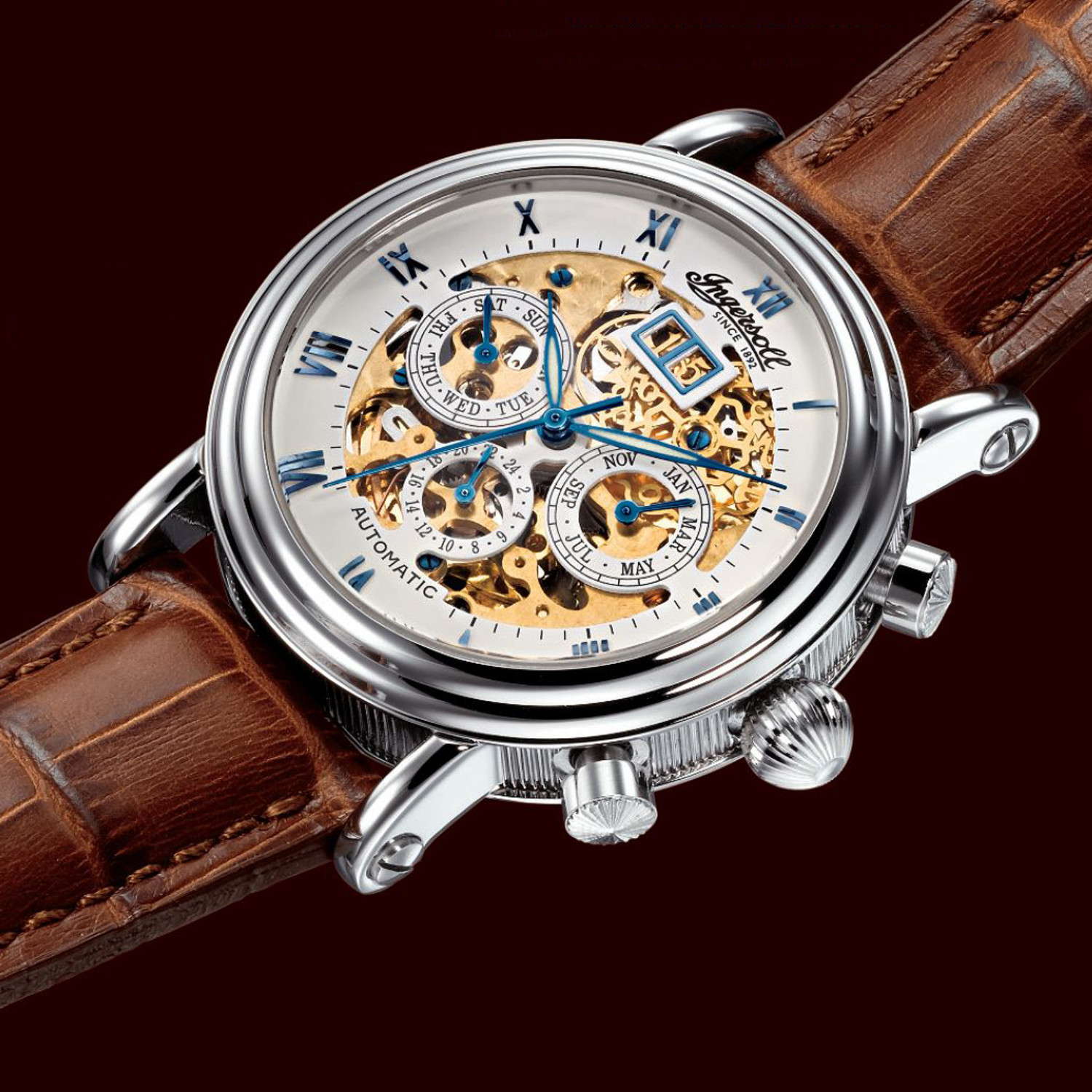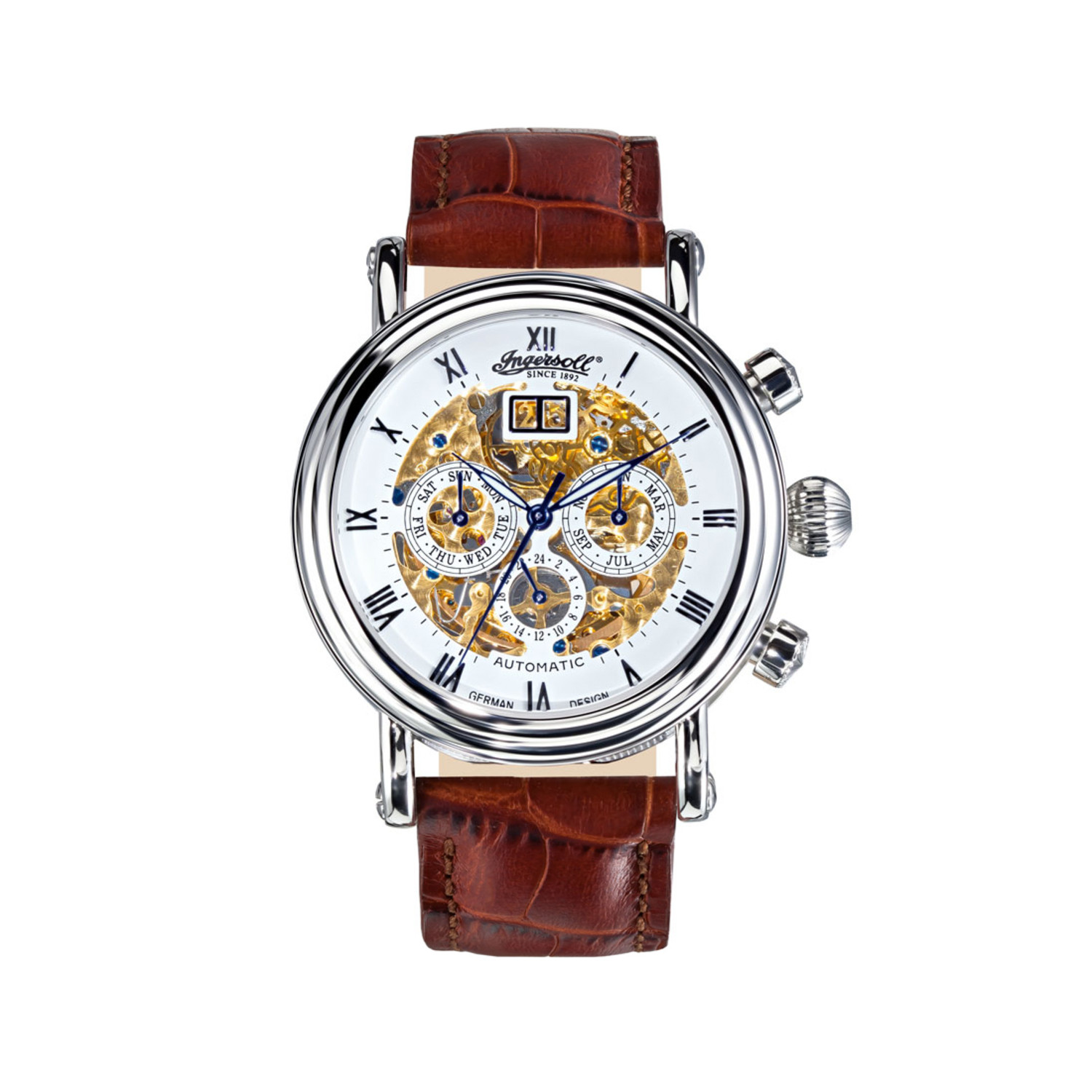 The handsome Gandhi functions on a 422 caliber automatic movement featuring month, day, date, and 24 hour displays, 5 ATM water resistance and a gorgeous skeleton face. It's a refined timepiece for those who don't want to choose between form and function.