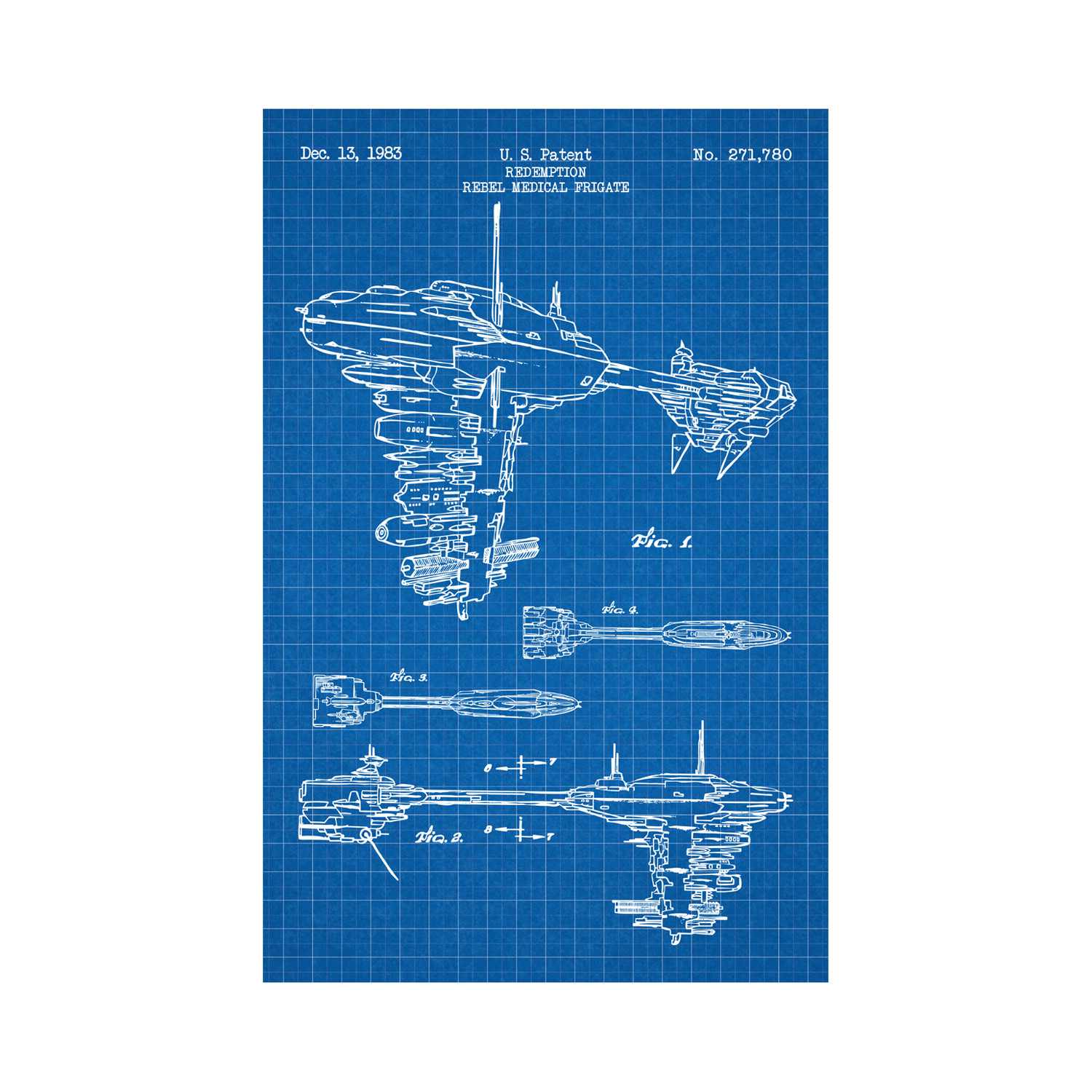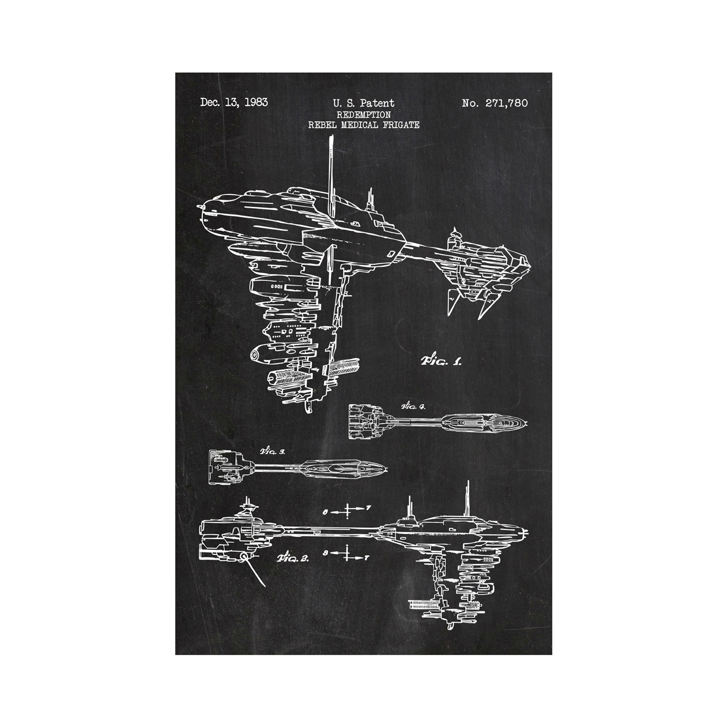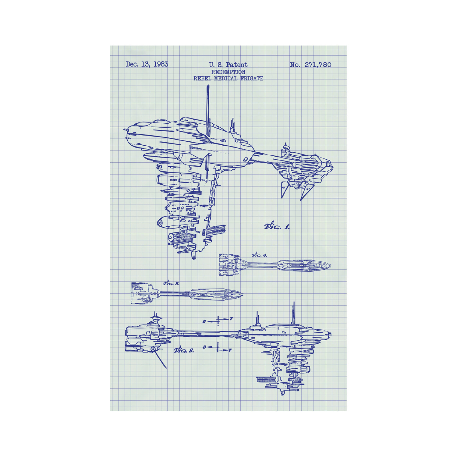 Rendered with acrylic ink on top of thick, high quality 100 lb. paper, this Star Wars patent print of a "Redemption" Rebel Medical Frigate has stemmed from the inspiration of the original creators! Screen printed artwork can be identified by its thick raised ink, which seems to catch the eye from every angle. By hand printing every order, Inked and Screened's team of artists create the prominent depth of field and texture that is found on each poster