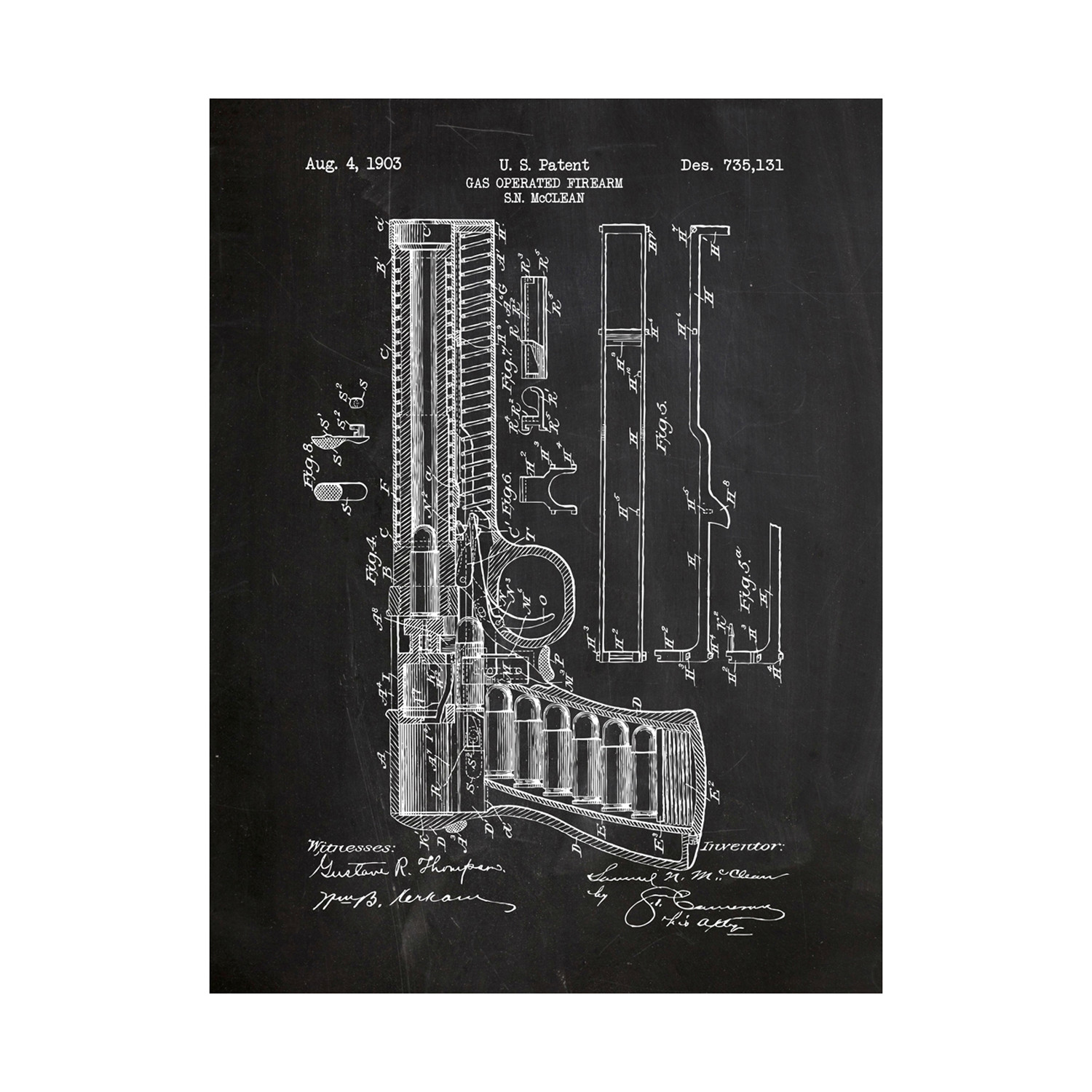 This Gas Operated Firearm patent print depiction is rendered with acrylic ink on top of thick, high quality 100 lb. paper. Screen printed artwork can be identified by its thick raised ink, which seems to catch the eye from every angle. By hand printing every order, Inked & Screened’s team of artists create the prominent depth of field and texture that is found on each poster.