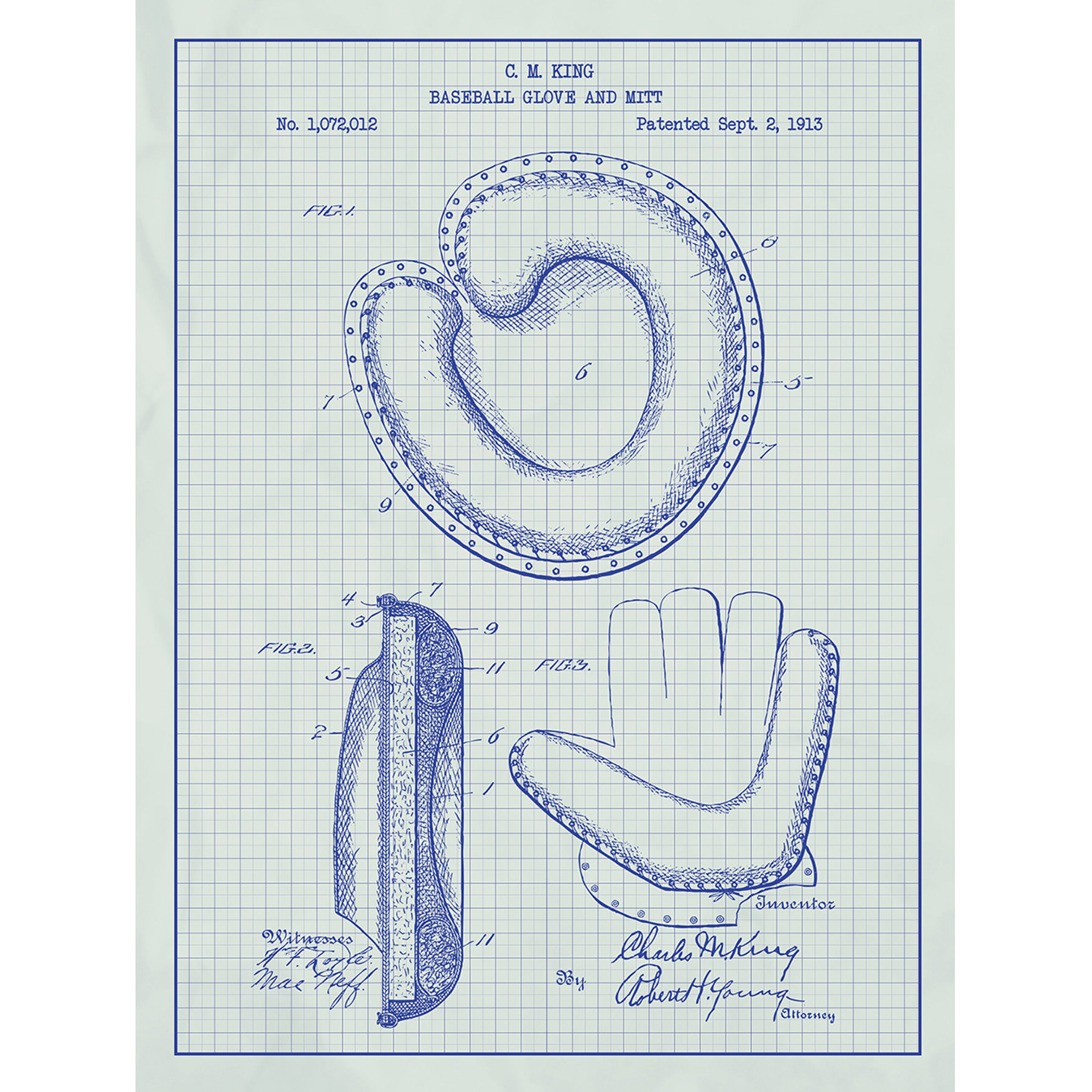 This stunning screen print features a blueprint-style image of the original patent for the traditional American baseball gloves. Hang it in your man-cave, or your office for the world'd most unique and artistic take on merchandise for sports lovers.
