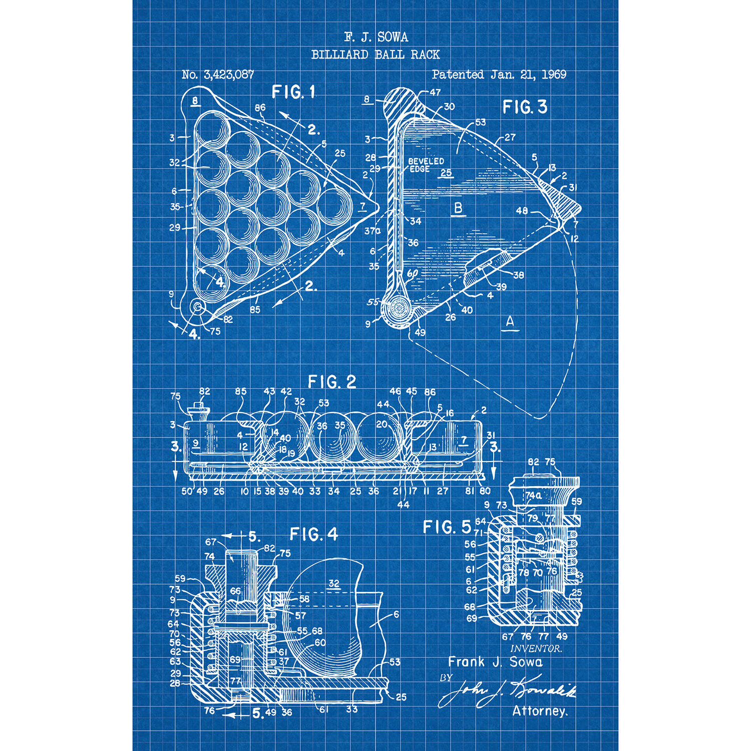 This stunning screen print features a blueprint-style image of the original patent for the classic billiard ball rack. Hang it in your man-cave, or your office for the world'd most unique and artistic take on merchandise for sports lovers.