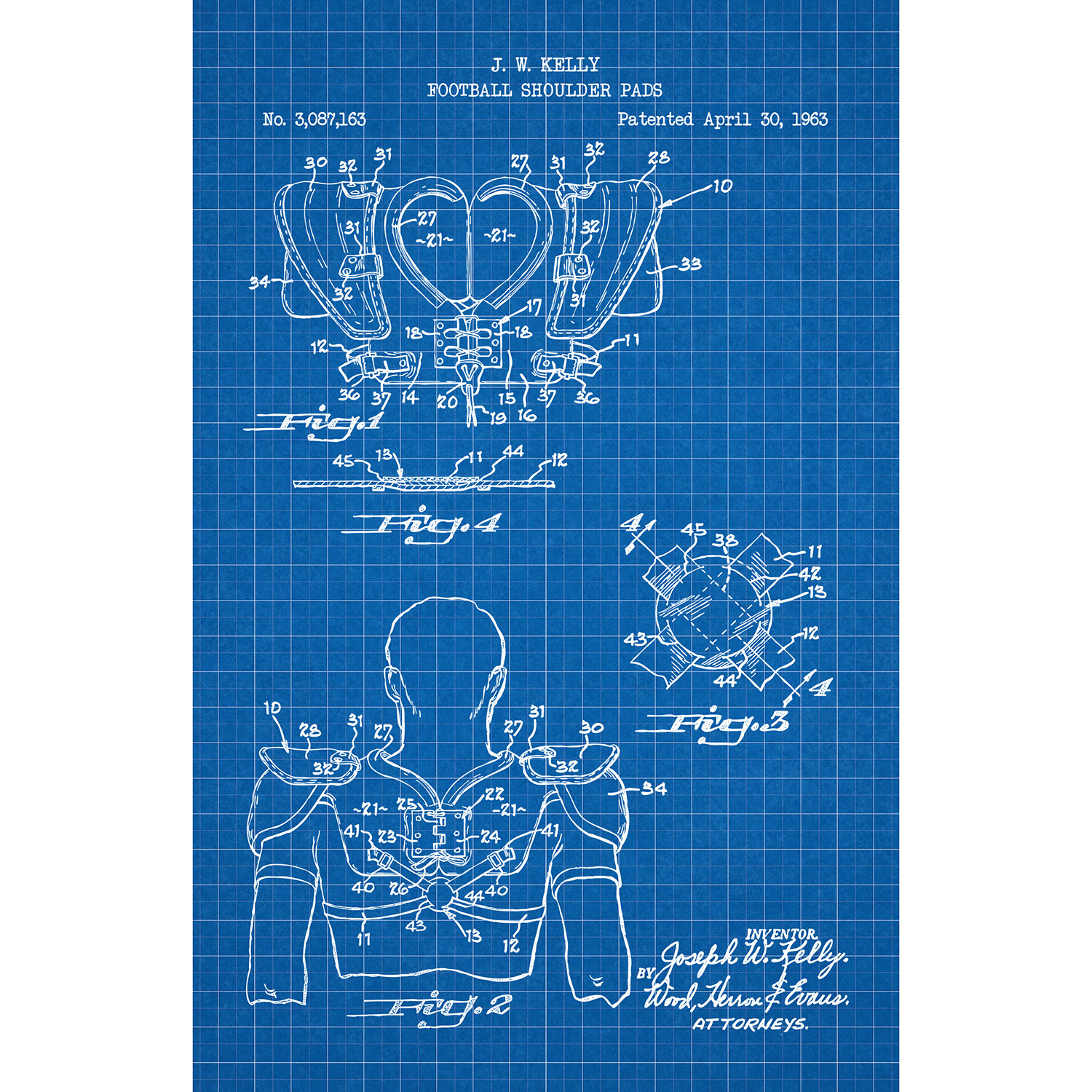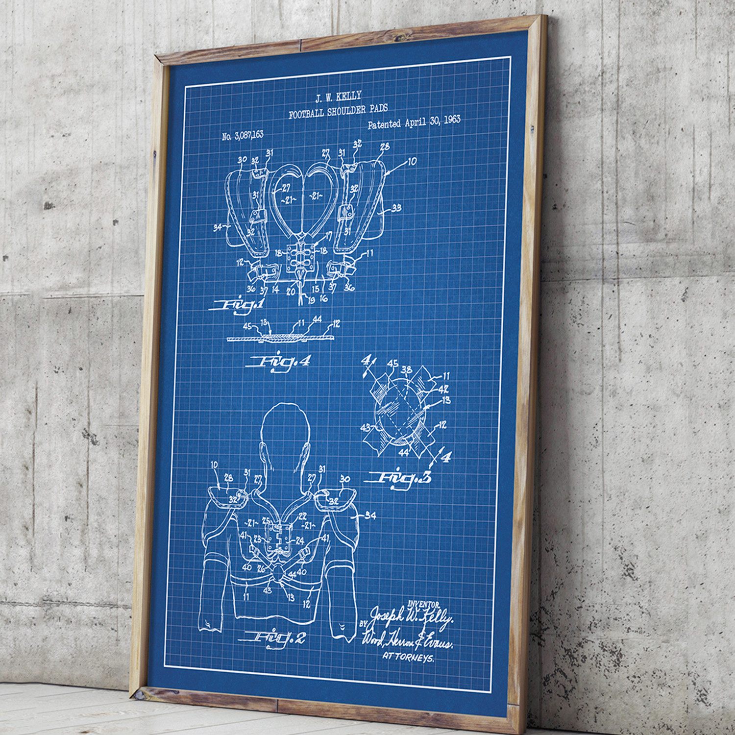 This stunning screen print features a blueprint-style image of the original patent for the classic American football pads. Hang it in your man-cave, or your office for the world'd most unique and artistic take on merchandise for sports lovers.