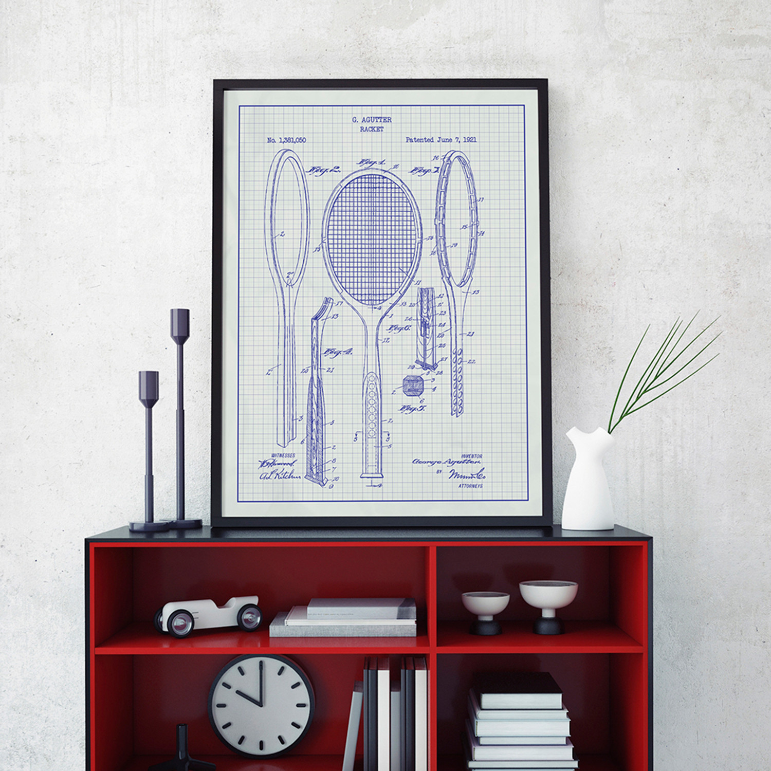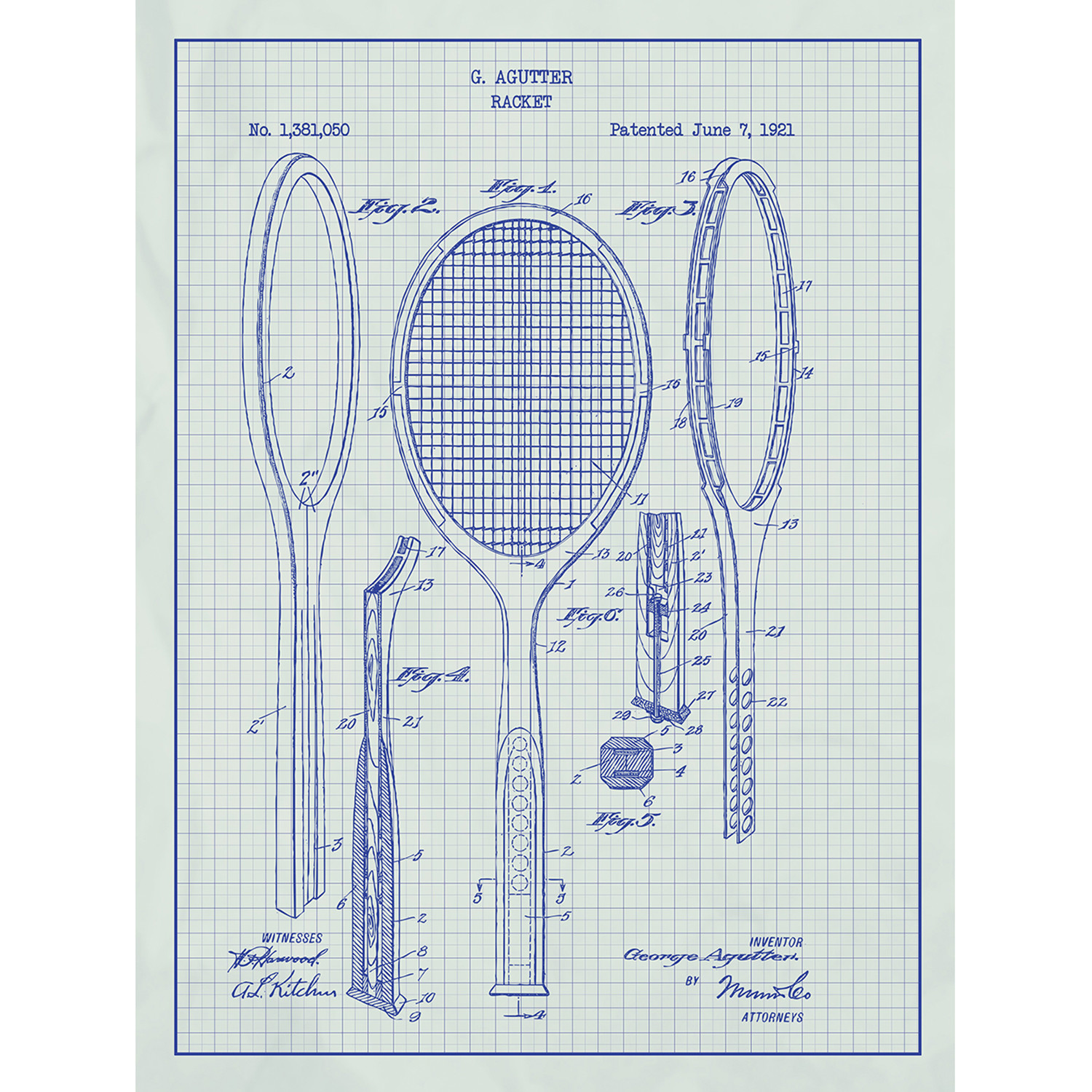 This stunning screen print features a blueprint-style image of the original patent for the classic tennis racket. Hang it in your man-cave, or your office for the world'd most unique and artistic take on merchandise for sports lovers.