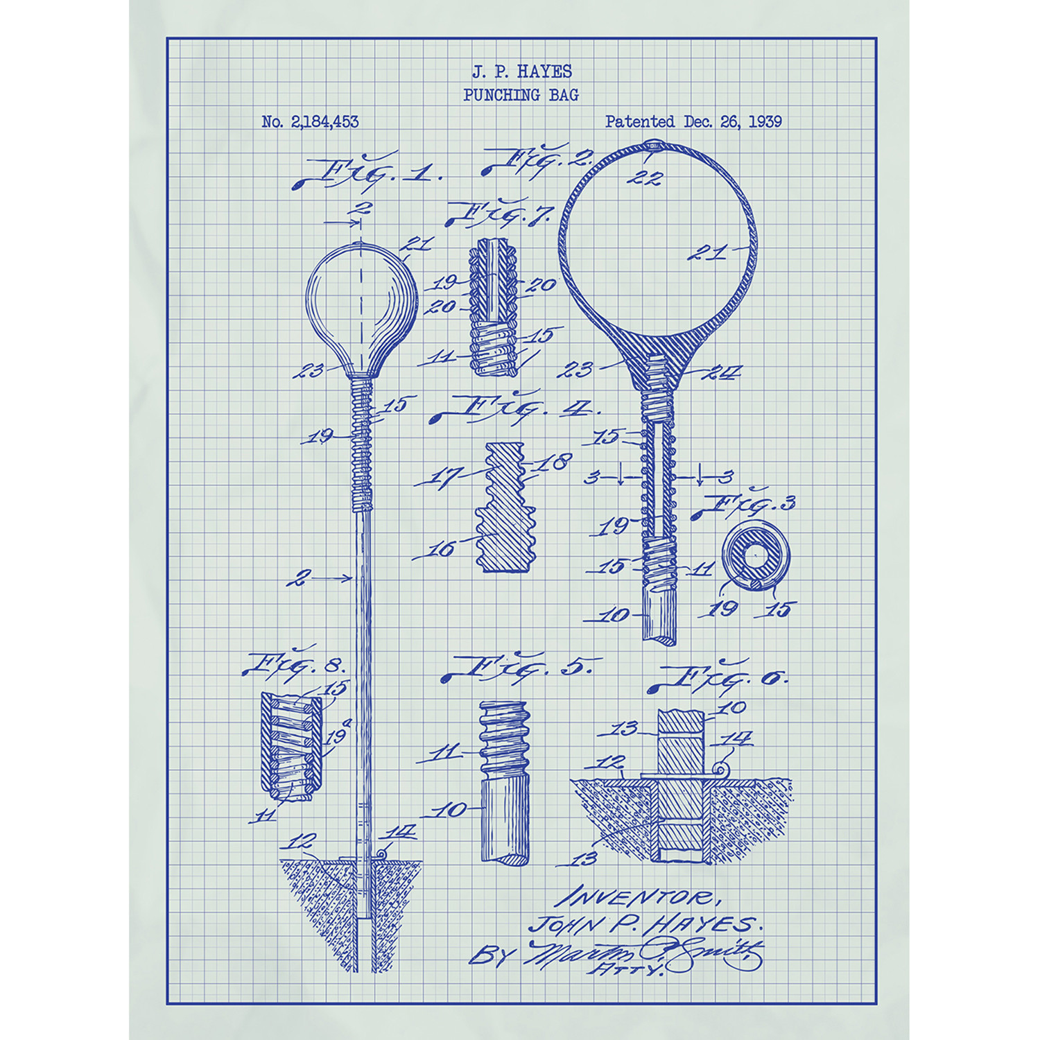 This stunning screen print features a blueprint-style image of the original patent for the classic speed bag. Hang it in your man-cave, or your office for the world'd most unique and artistic take on merchandise for sports lovers.