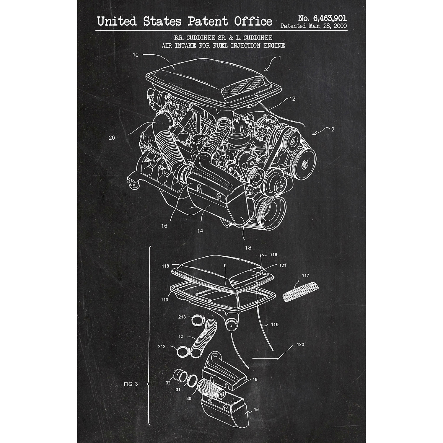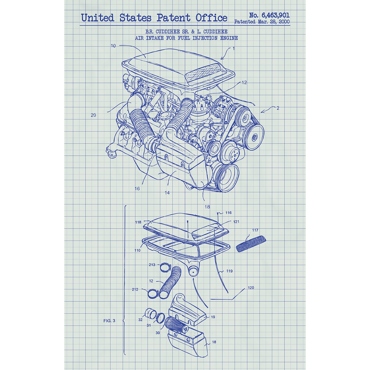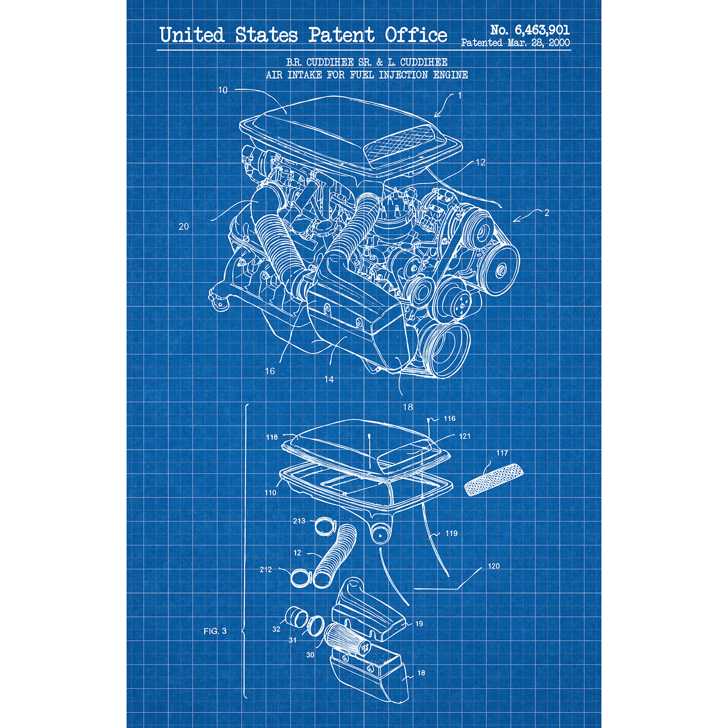 This Air Intake patent print depiction is rendered with acrylic ink on top of thick, high quality 100 lb. paper. Screen printed artwork can be identified by its thick raised ink, which seems to catch the eye from every angle. By hand printing every order, Inked & Screened’s team of artists create the prominent depth of field and texture that is found on each poster.