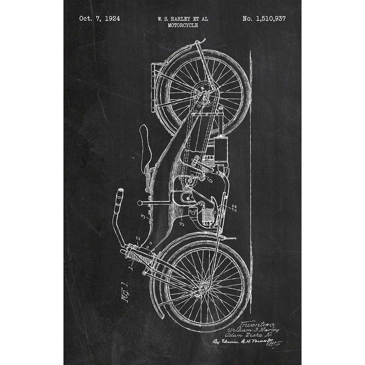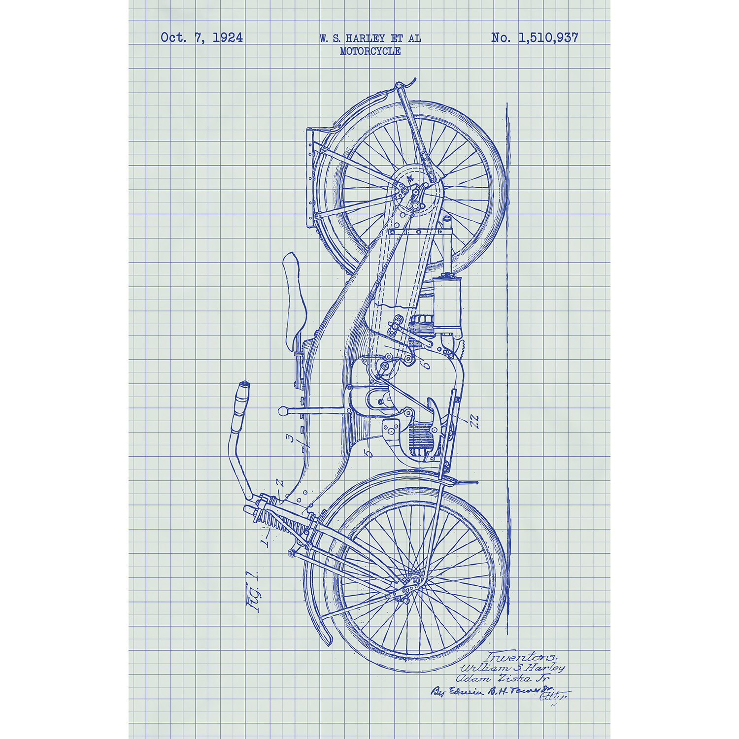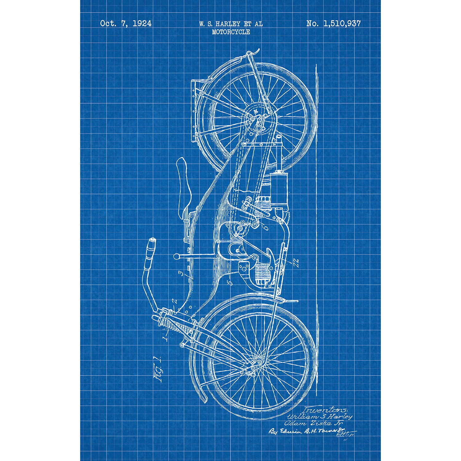 This Harley Davidson Motorcycle patent print depiction is rendered with acrylic ink on top of thick, high quality 100 lb. paper. Screen printed artwork can be identified by its thick raised ink, which seems to catch the eye from every angle. By hand printing every order, Inked & Screened’s team of artists create the prominent depth of field and texture that is found on each poster.