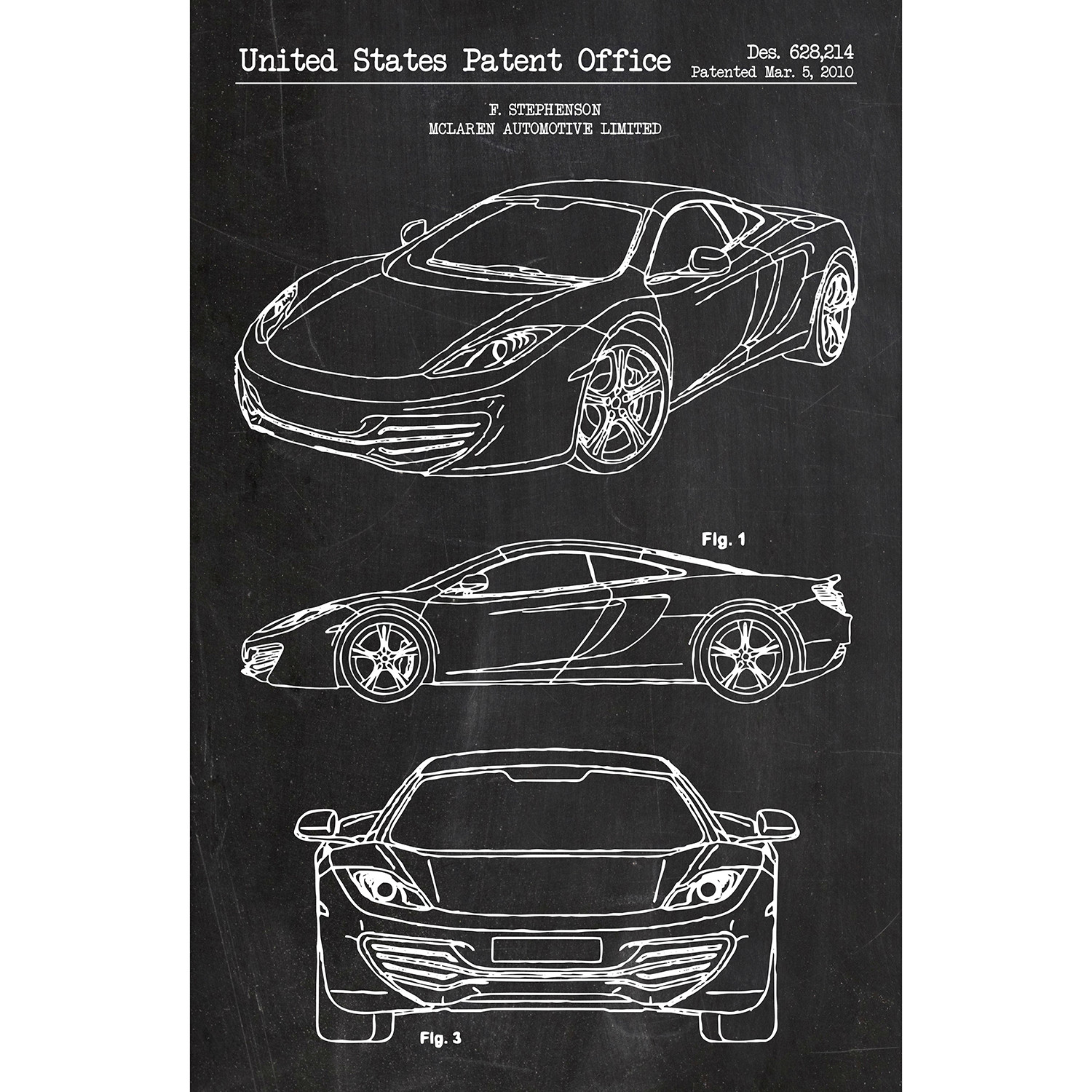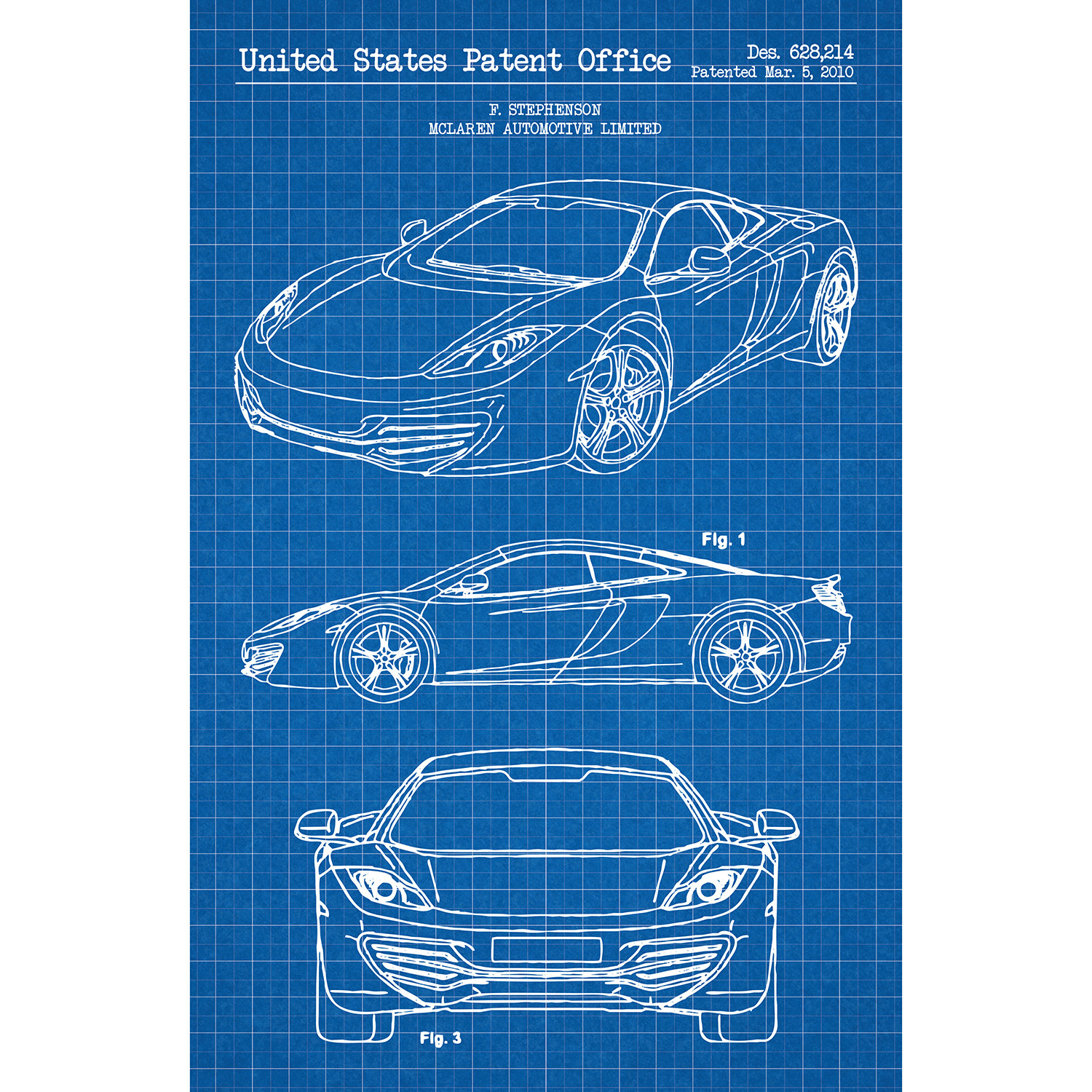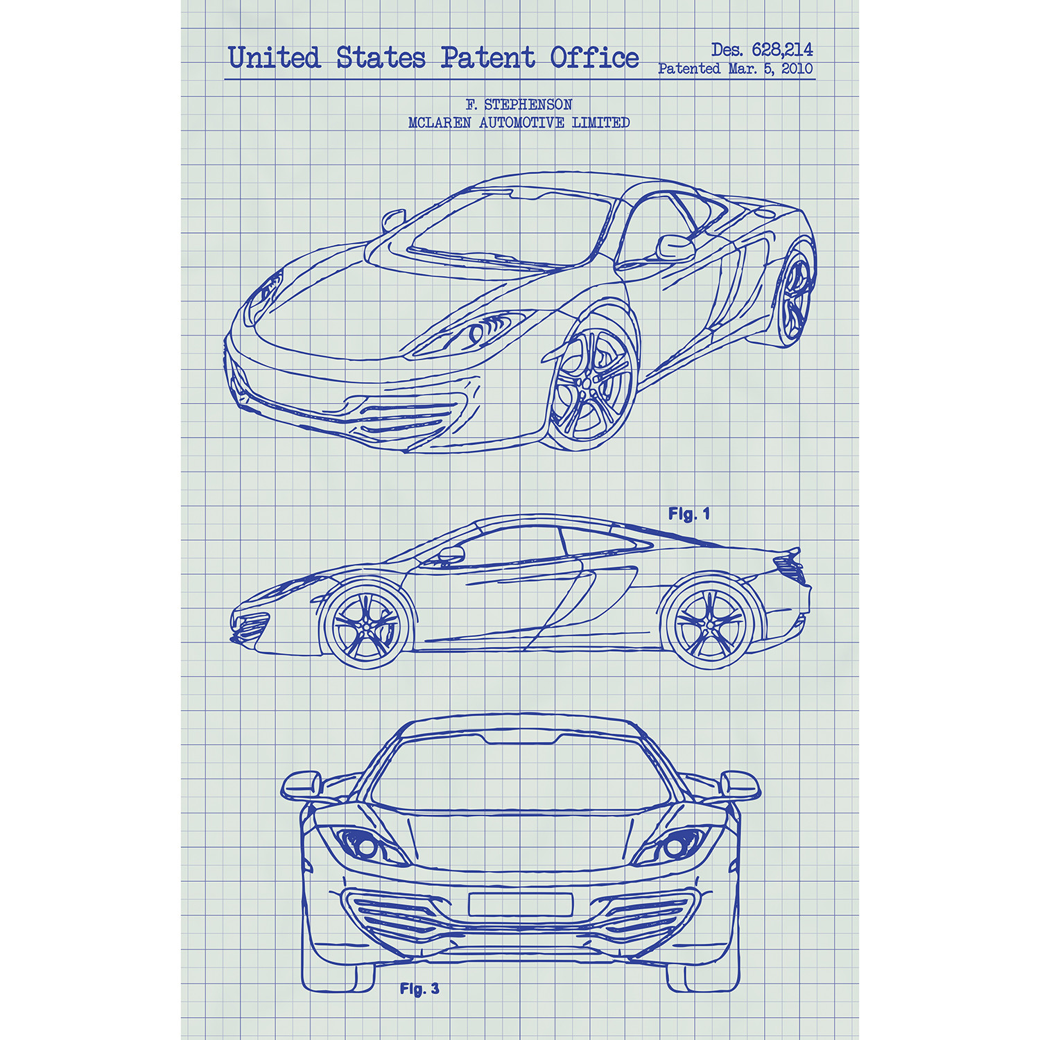 This McLaren MP4-12C by F. Stephenson patent print depiction is rendered with acrylic ink on top of thick, high quality 100 lb. paper. Screen printed artwork can be identified by its thick raised ink, which seems to catch the eye from every angle. By hand printing every order, Inked & Screened’s team of artists create the prominent depth of field and texture that is found on each poster.