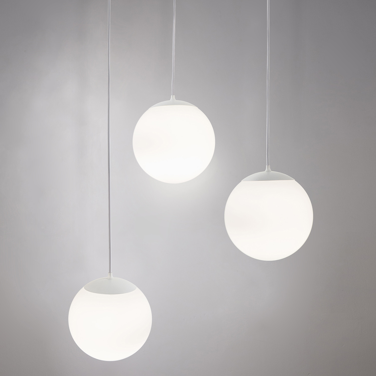 Drop is a white frosted glass globe delicately topped with a white powder coated stainless steel cap. Resembling a drop of pristine pearl, it is reminiscent of the flourishes of the mid-century.