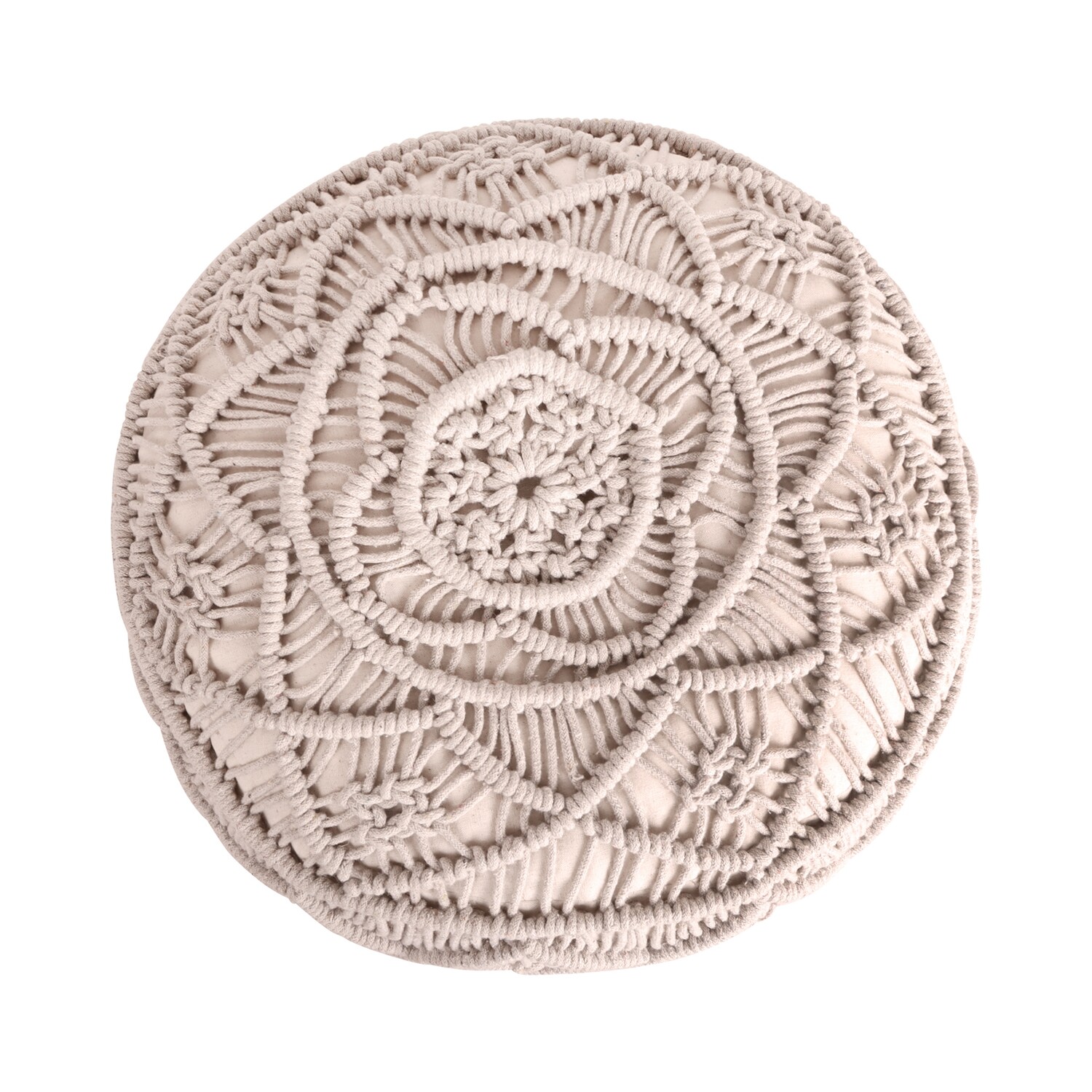 This round comfy pouf ottoman provides a trendy element to your décor. Its intricate knitted pattern incorporates detailed diamond and flower-like bands, creating rich texture and depth. This elegant hand-knitted pouf may be used as a seat, a lounger, a footrest, or a decorative accessory for your living room décor.