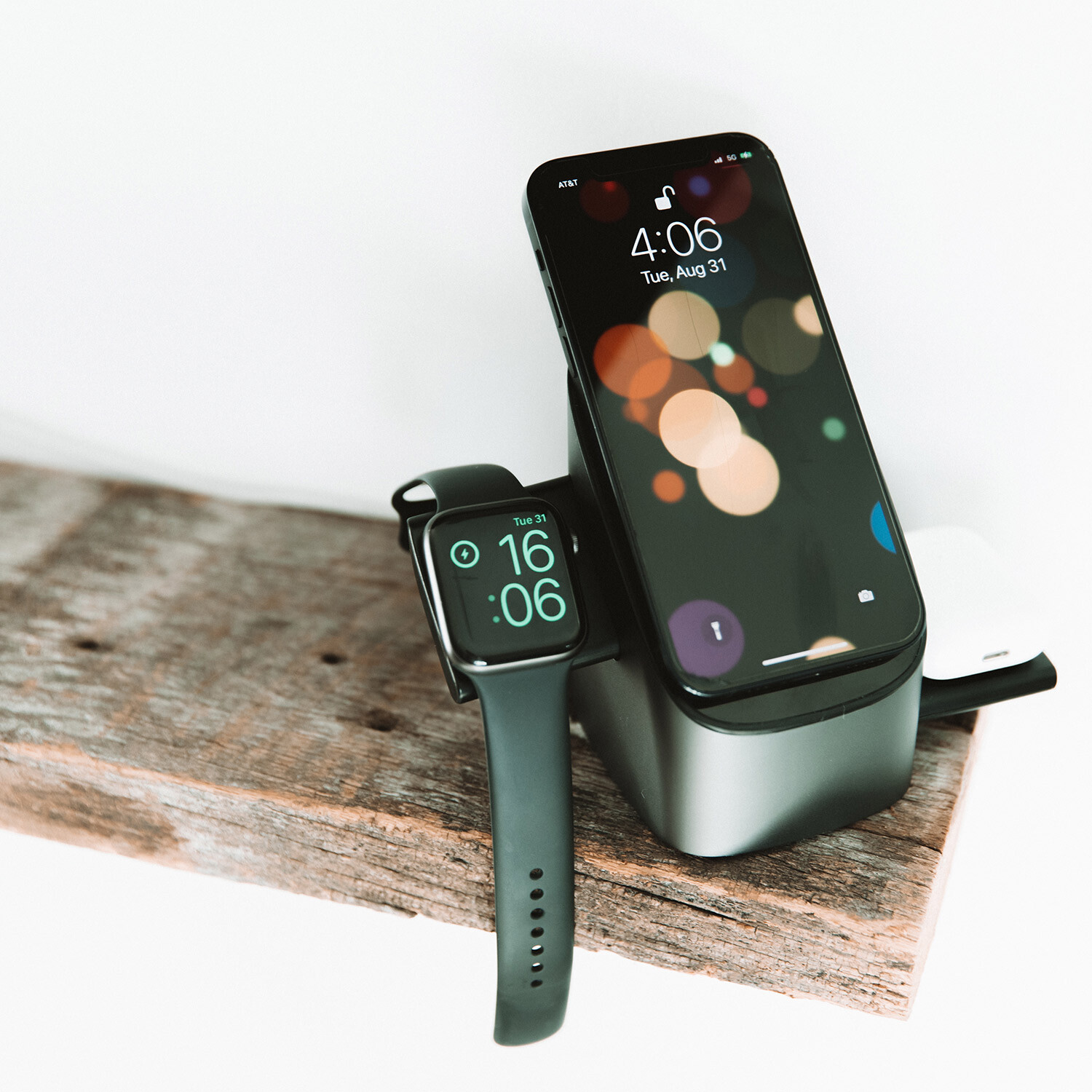The StepUp magnetic wireless charging hub features a modern design that can simultaneously charge your iPhone 12 or 13, AirPods, and Apple Watch. Compatible magnets hold your phone perfectly in place while charging so you never have to worry about proper alignment—charging is automatic! Don't need to charge an Apple Watch or AirPods? No problem, slide the charging docks back into StepUp for a sleek and streamlined look.