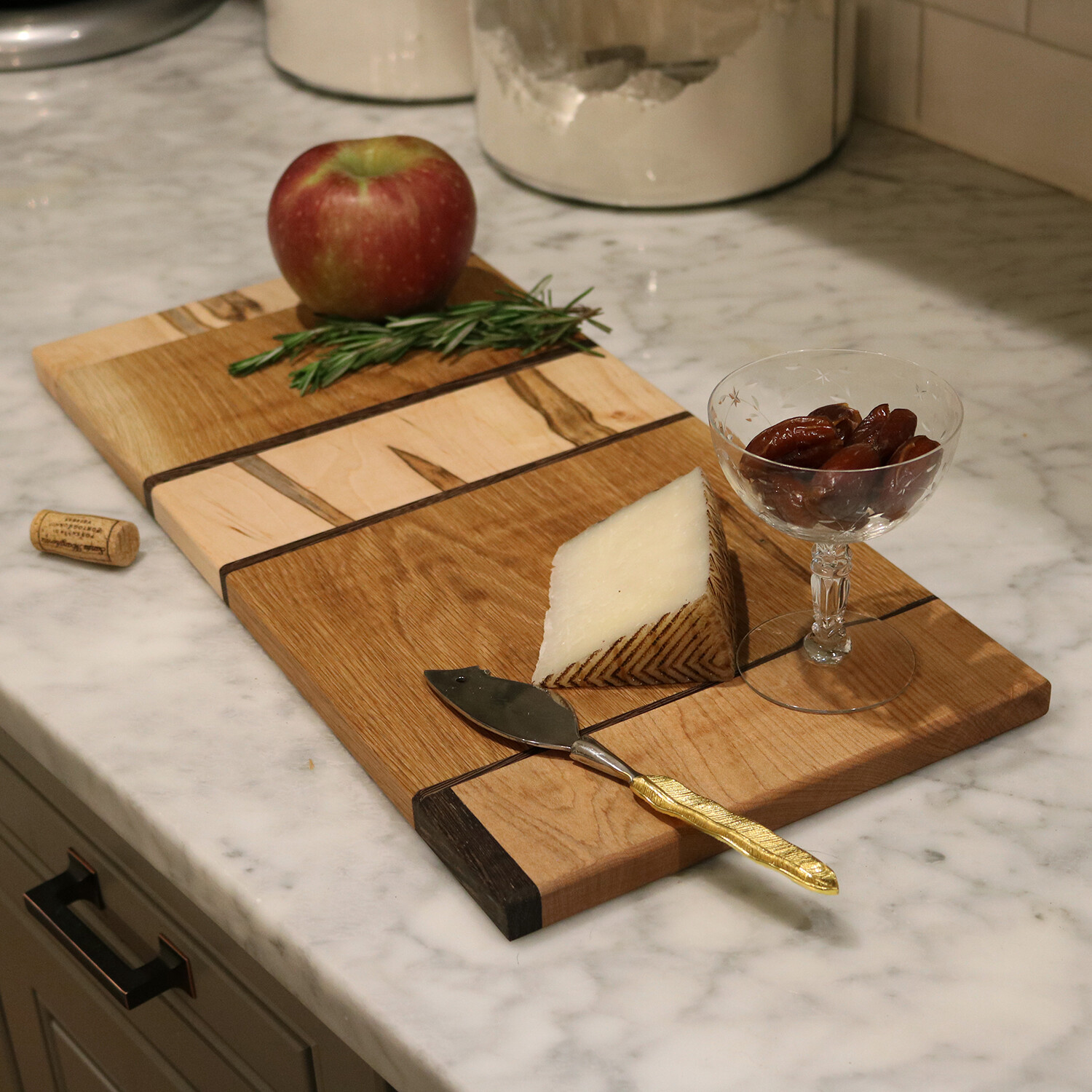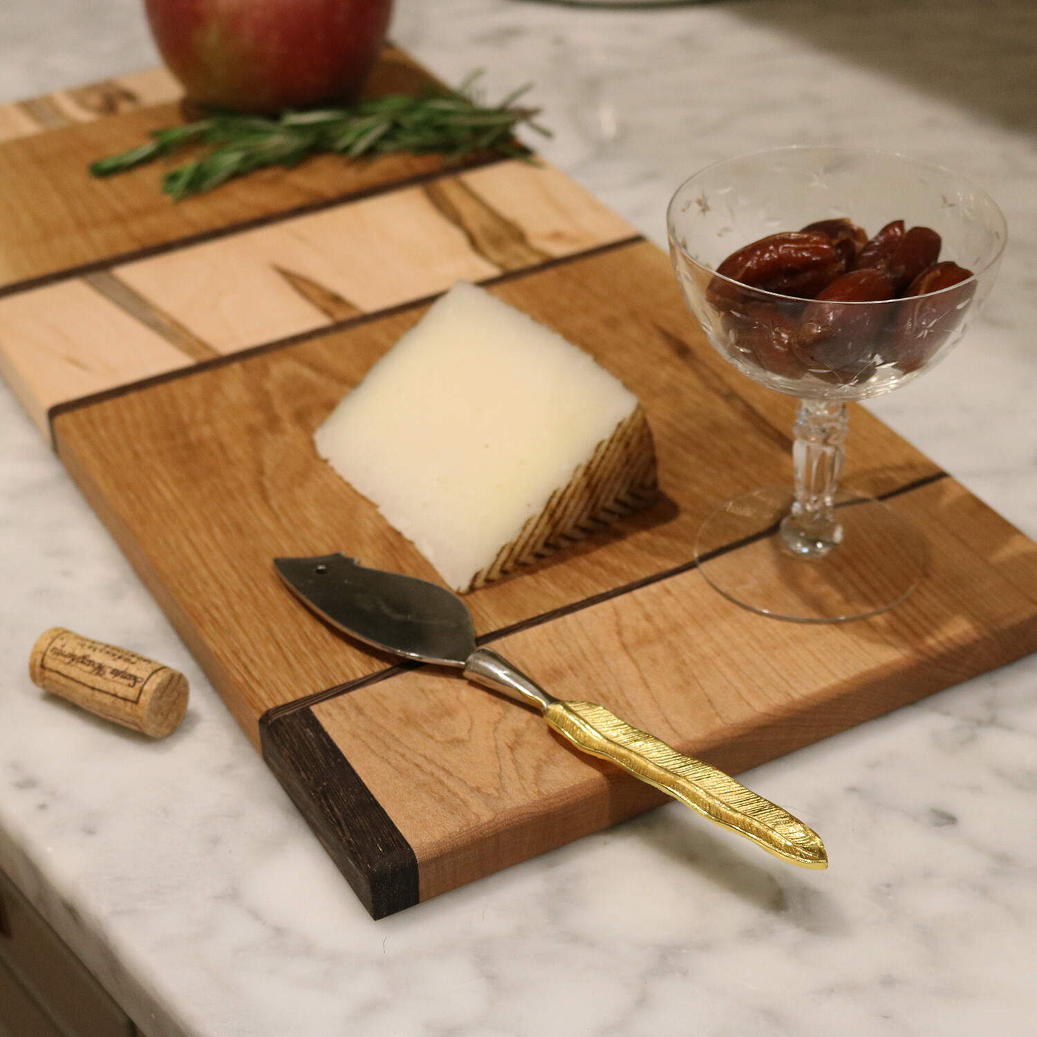 The Bryce Reclaimed Serving Board is made with 100% reclaimed rare and exotic hardwoods. It has been treated with organic food grade oil sealant and wood conditioner. 10 individual pieces of wood were used to create this board. The species of wood used are rare and exotic hardwoods, including: white oak, ambrosia maple, red oak, walnut, wenge, & cherry
