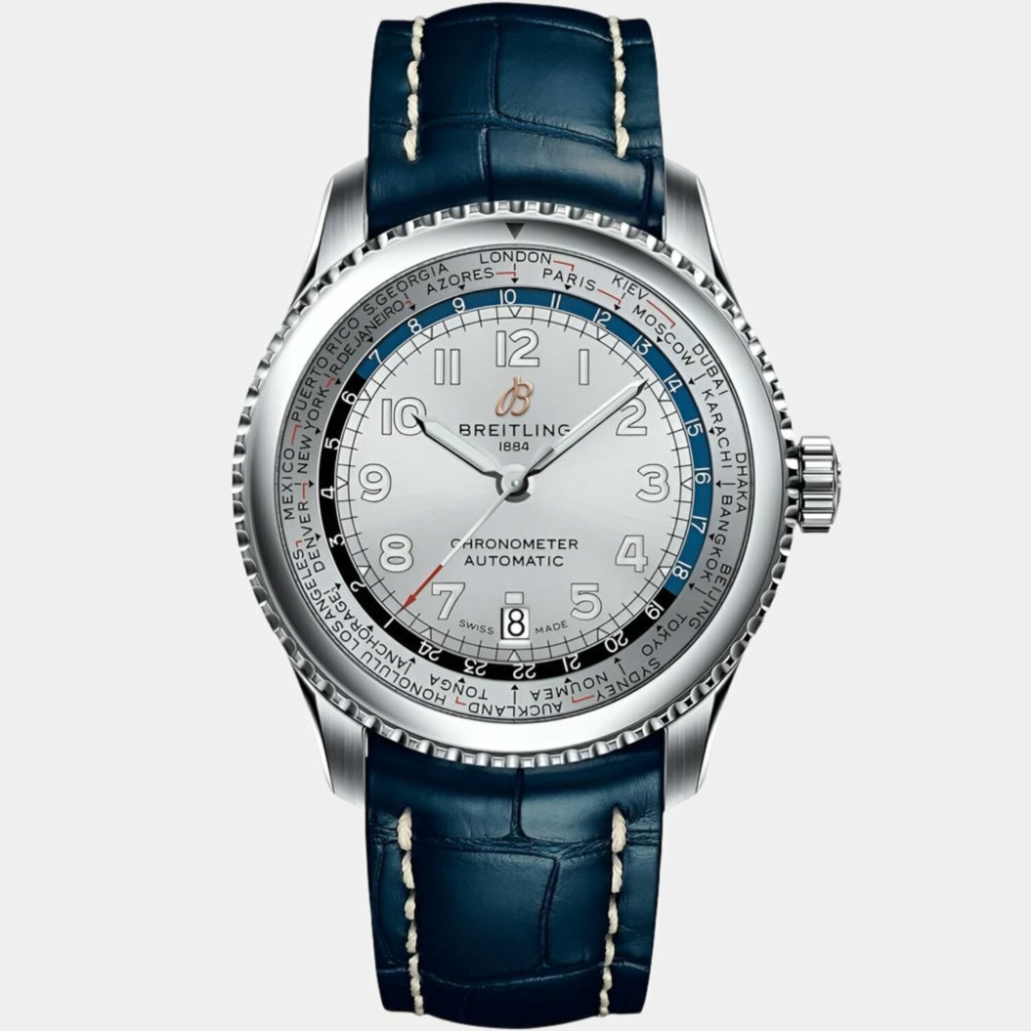 With its timeless design and innovative features, this men's timepiece is a masterful blend of sophistication and functionality. Crafted from durable stainless steel, it boasts a striking silver dial, enhanced by a scratch-resistant sapphire crystal that protects its intricate details. The bi-directional rotating bezel offers intuitive world-time tracking, perfect for the modern traveler. A luxurious alligator leather strap in a deep blue hue completes the look, ensuring both comfort and style. Water-resistant up to 100 meters, this watch is not only a reliable companion for everyday wear but a symbol of adventure and precision.