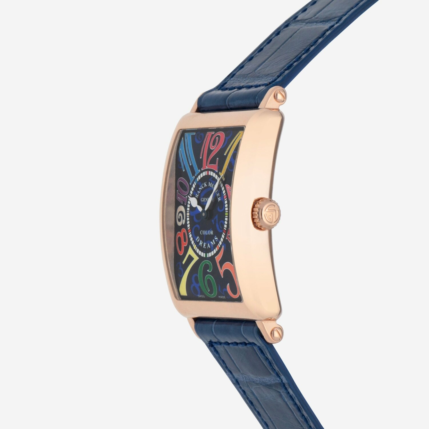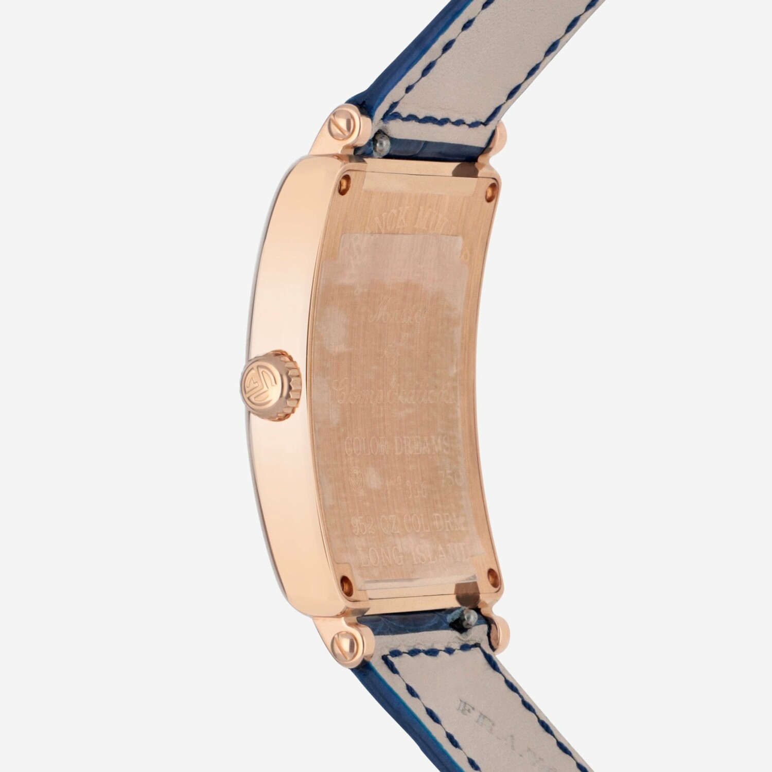 A vibrant creation from Franck Muller's Long Island Color Dreams series, this 26mm women’s timepiece radiates charm and sophistication with its rich blue dial and coordinating blue leather strap. The 18K rose gold case beautifully frames the dial, bringing warmth and a luxurious contrast to its lively colors. Powered by a quartz movement, this Swiss-made watch combines Franck Muller's signature playful aesthetic with timeless elegance, making it an exquisite choice for casual and dress occasions alike.