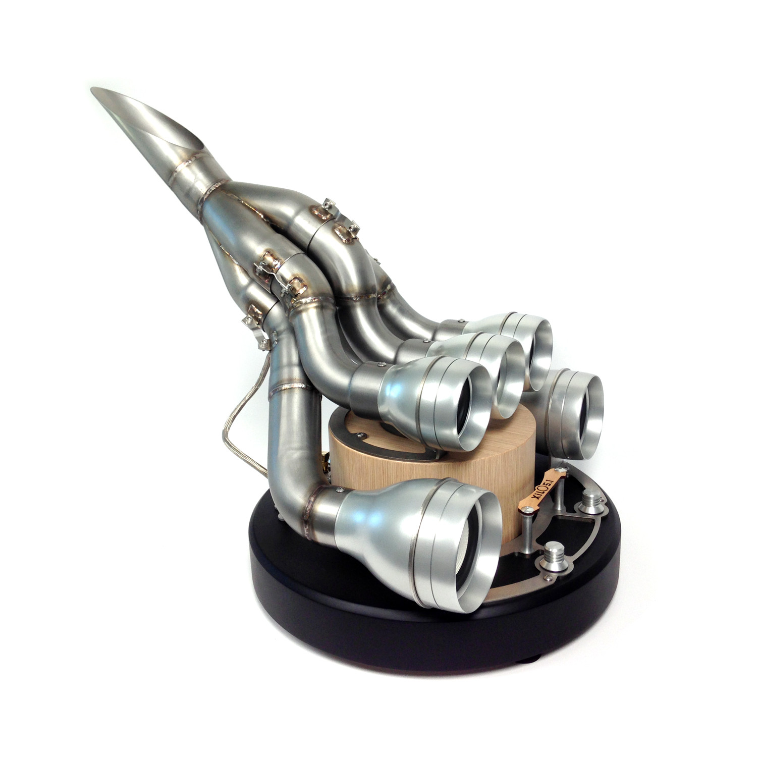 The XiLO speaker is stunningly crafted from wood and steel. Completely handmade in Italy, it's a gorgeous combination of automotive design and audio prowess. Its exhaust is compatible with the F1 Ferrari 052 engine, F2003 GA. The base and the cylinder in the middle are in wood, which is the best material for the exaltation of the sound. Last but not least, the cylinder contains its subwoofer, and XiLO can be connected to all the devices thanks to the Bluetooth connection.