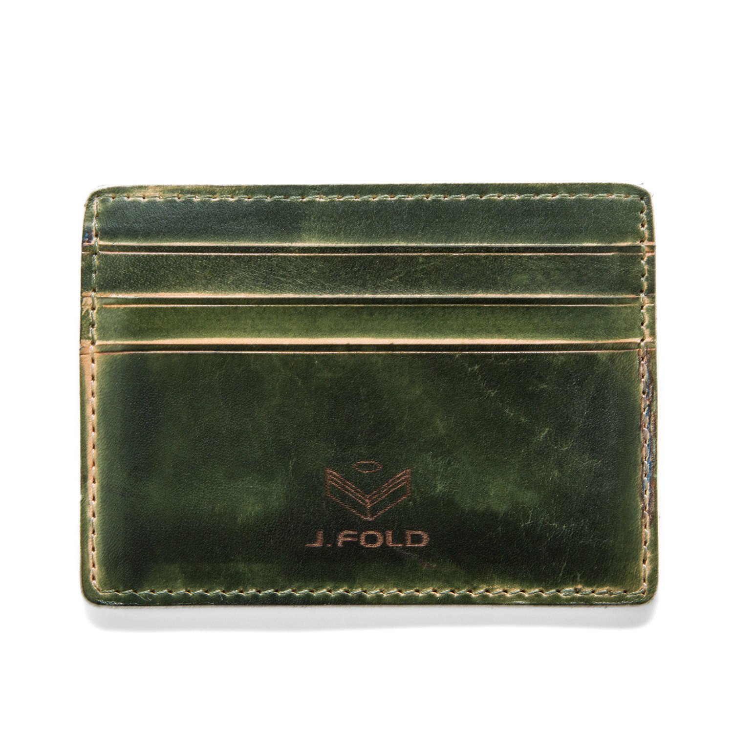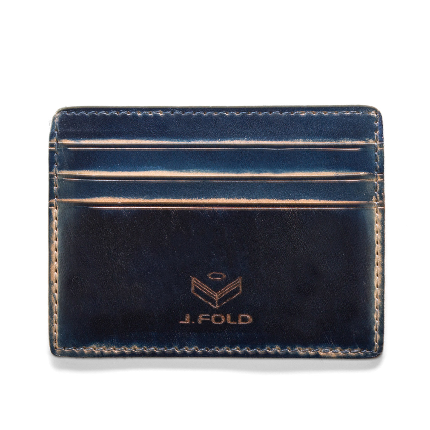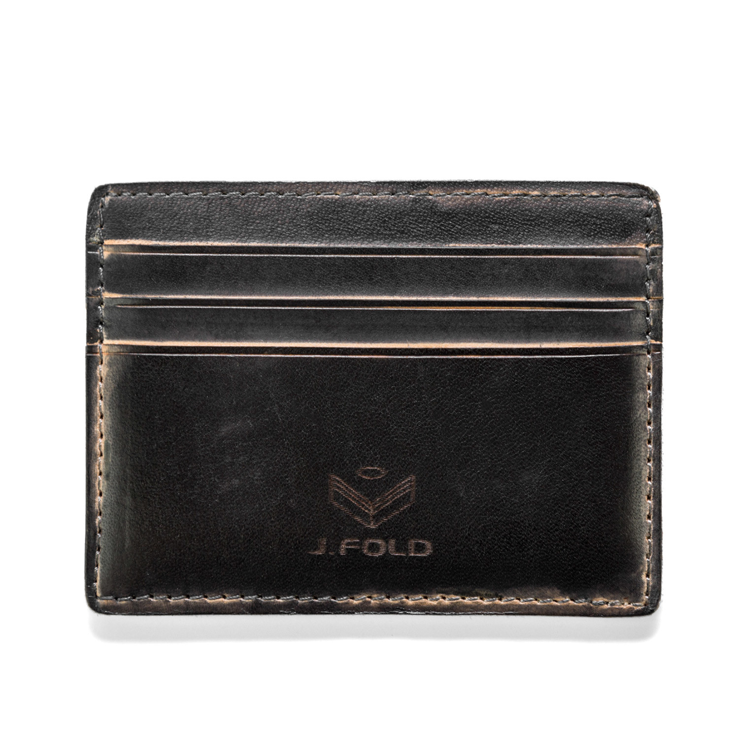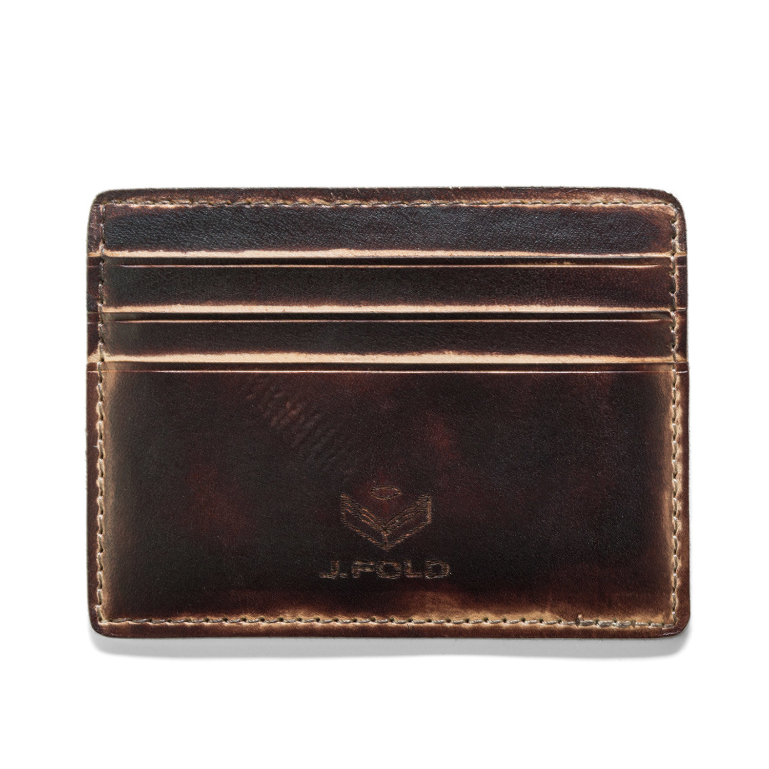 The Hand Stained Card Carrier is a 100% genuine hand cut leather and features four card slots and signature J. Fold logo. The hand-stained look is totally unique and ages beautifully.