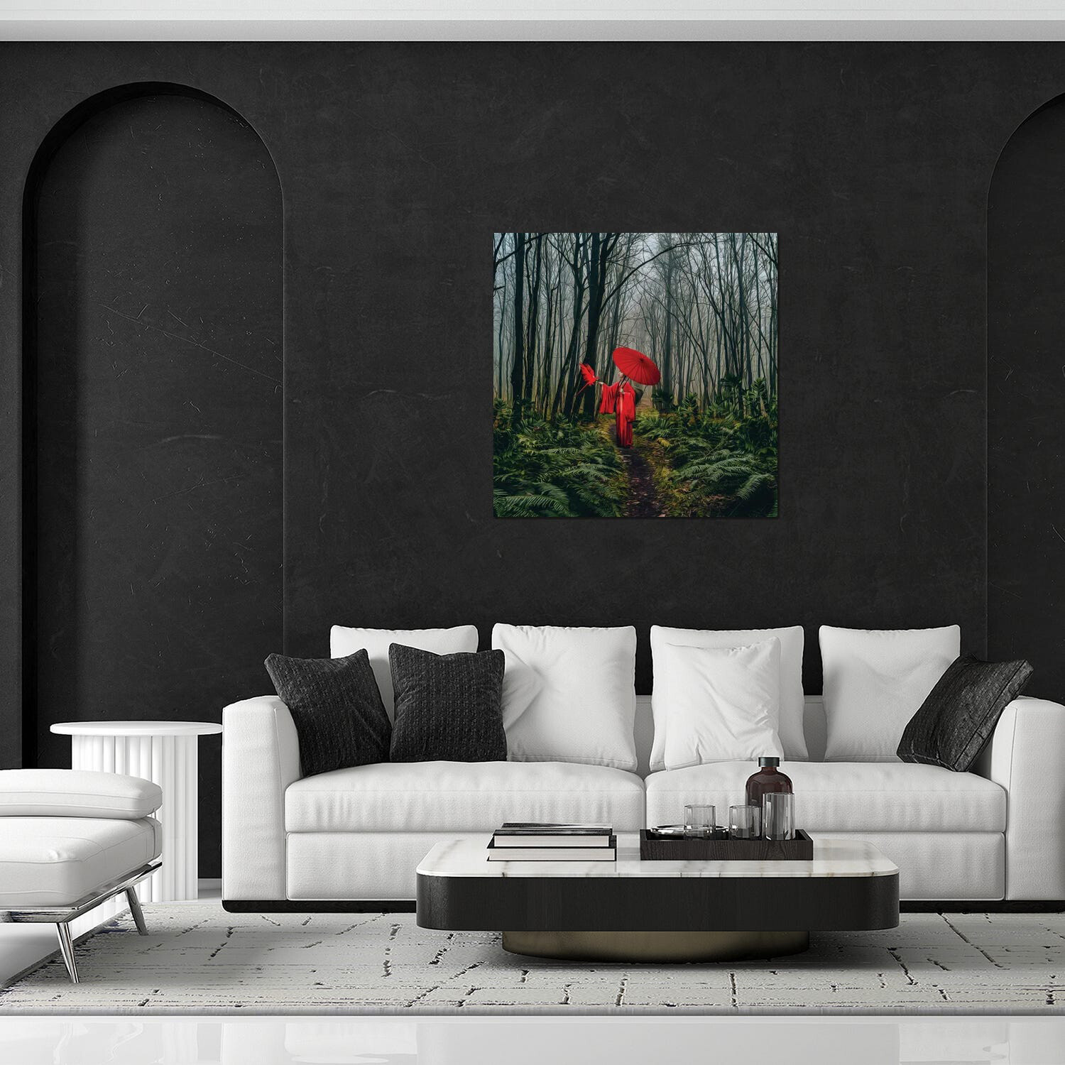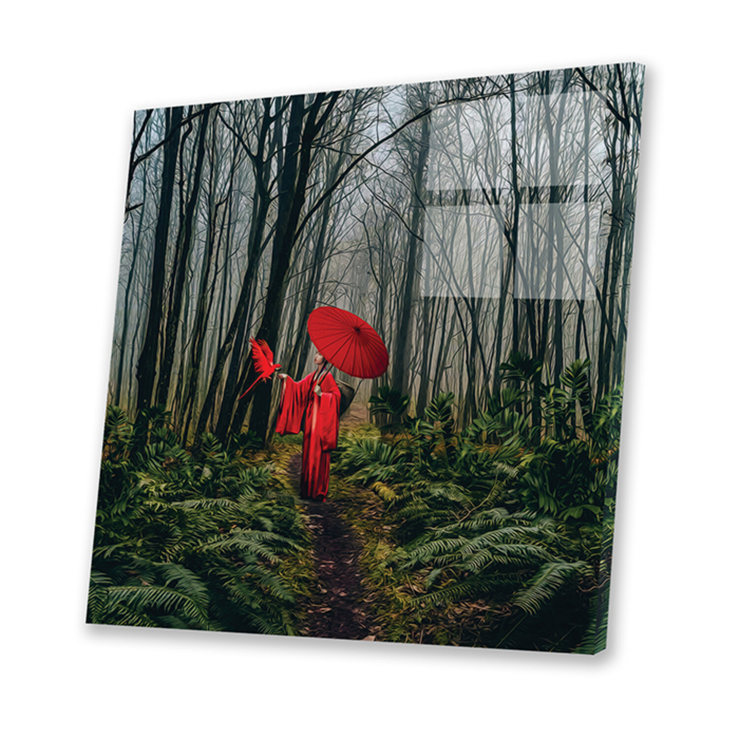 A Girl In A Red Kimono Feeds A Bird From Her Hand Print // Ievgeniia Bidiuk (24"H x 24"W x 0.25"D)