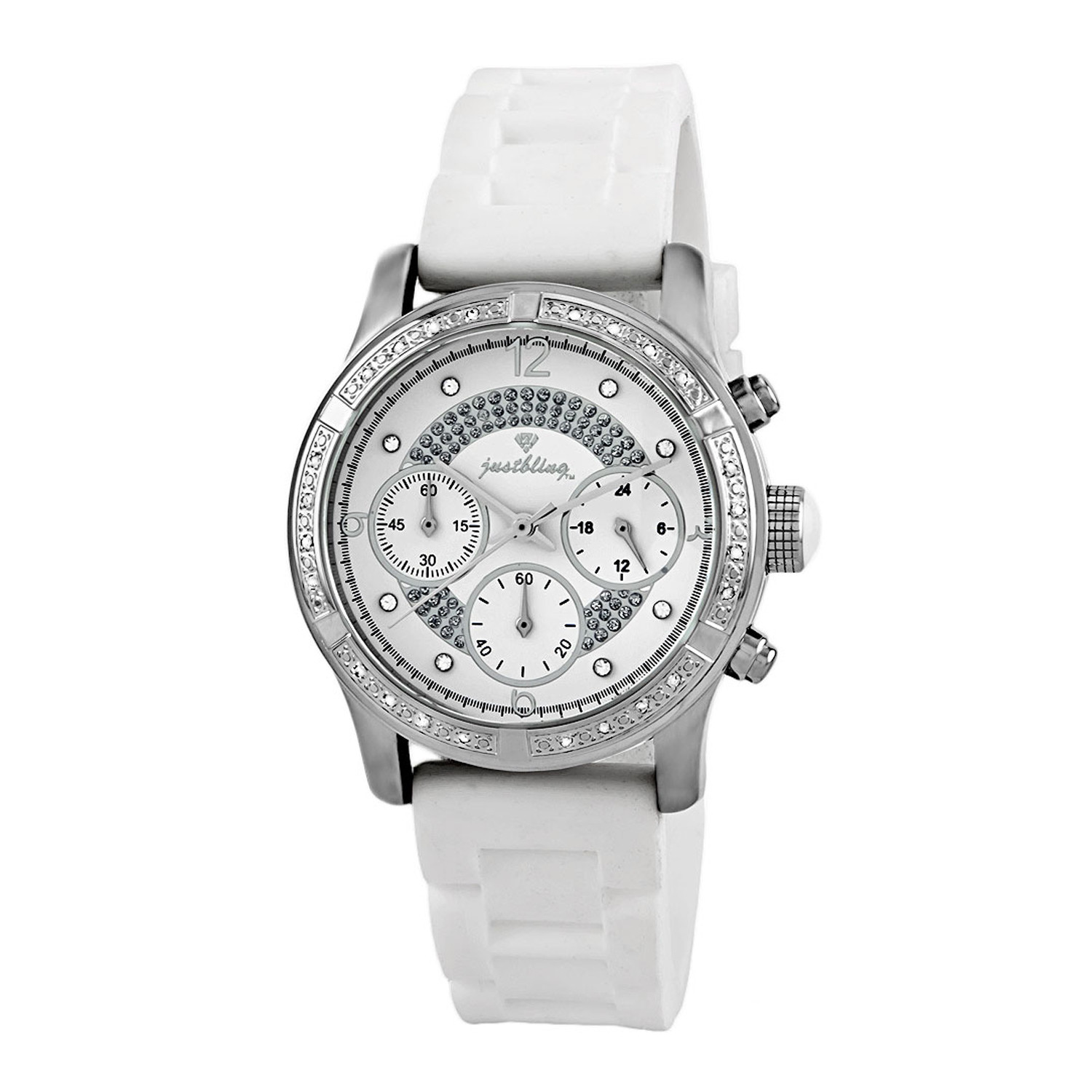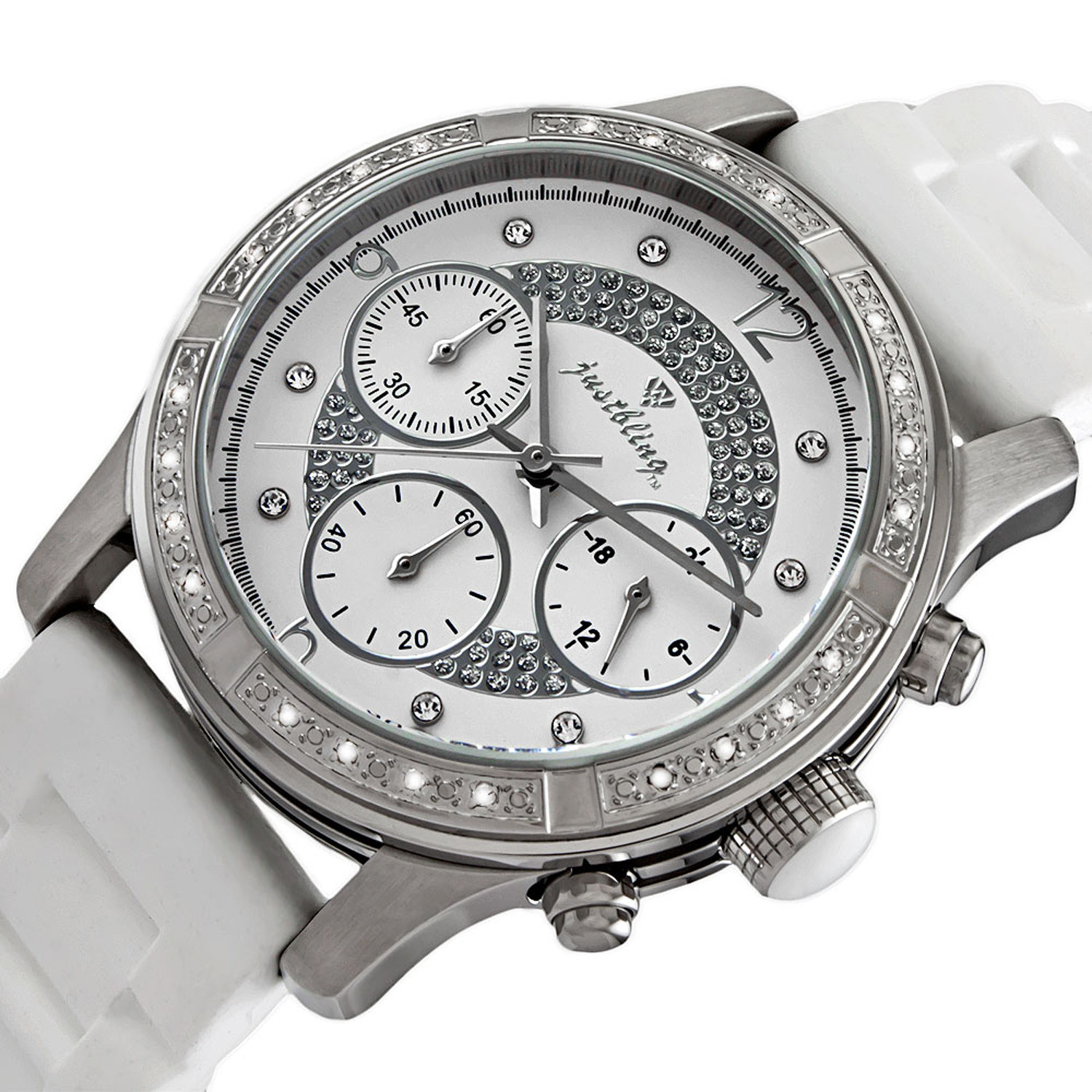 The Venus Sport by JBW is a watch designed with energy and individuality in mind. This watch is exquisitely crafted - the white dial features stone decoration and the chronograph movement on the dial not only tracks the time, but also makes this watch functional for any occasion. Silver hour markers make telling time easy. On the silver bezel are 24 diamonds that add a little luxury to your style. This watch is classic in design, but the intricate and light weight details give it the sporty feel you are looking for.