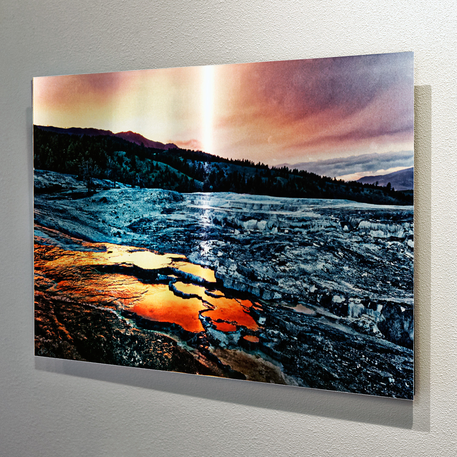 Mammoth Springs Sunset // Yellowstone is a magical new metal print from French photographer Jean-Claude Louis. Metal prints represent a new art medium for presenting photographs by infusing dyes, using heat and pressure, directly into coated brushed aluminum plates. The image is infused into the surface of the print — not simply resting on it. The colors of this masterpiece are vibrant with exceptional detail and resolution. As the light plays with the brushed metal and the inks, the image will take on an almost magical luminescence.