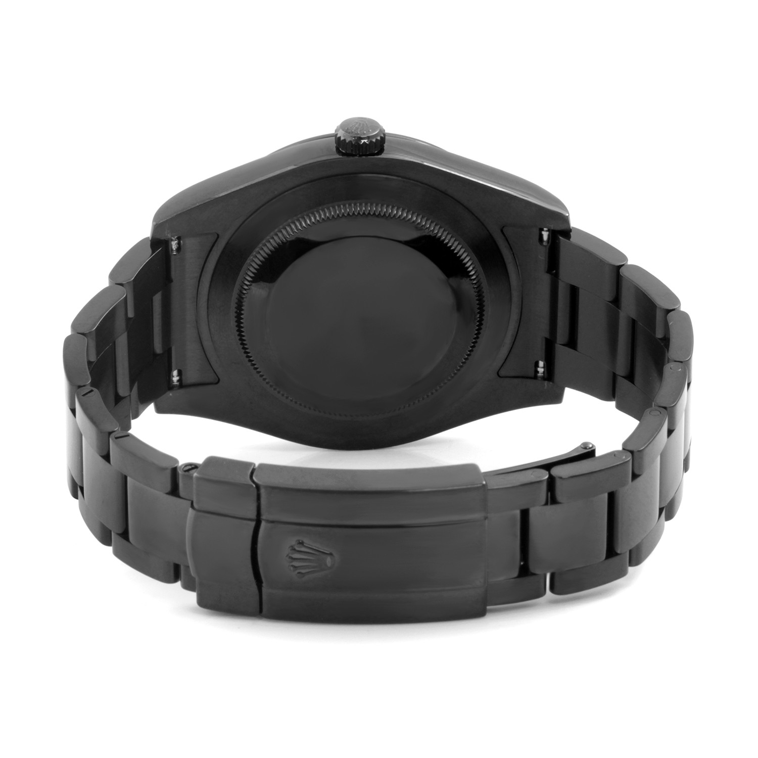 This Rolex has been carefully inspected, restored, and protected with an all-black PVD coating. The process involves completely disassembling the watch and placing it in a vacuum chamber to be blasted with a DLC (Diamond-Like Carbon) coating.
