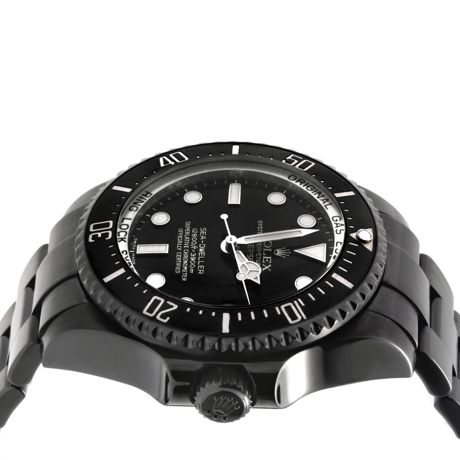 Rolex’s most over-engineered divers’ watch, featuring the patented Ringlock System, a lightweight, yet nearly indestructible, nitrogen-alloyed internal frame, the Sea Dweller DEEPSEA is used by professional divers when ultimate reliability and robustness are a must. This model features a badass all-black finish.