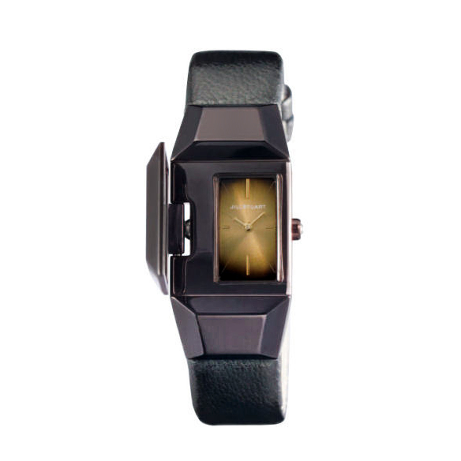 Jill Stuarts "locket watch" design is intended to reveal the time—purely when needed. With a clever clasp over the face, it both conceals and tells the time on demand, leaving a gem-like, geometric form on your wrist like a bracelet. The streamline look and design offers both a charming wrist accessory and quality time piece in one.