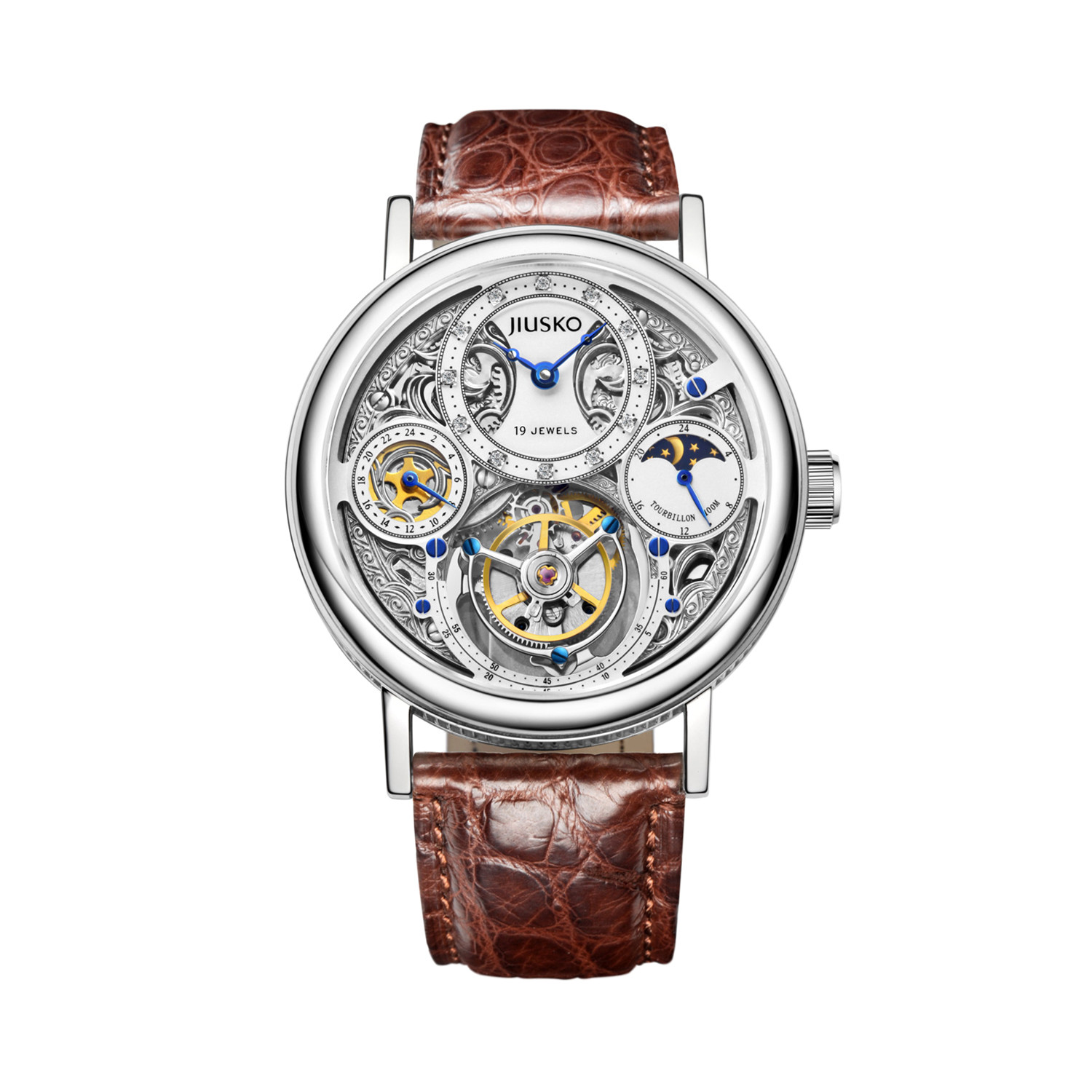 The JIUSKO Noble Mechanical Tourbillon skeletonizes both the watch dial and the movement itself, cutting away all the brass plates, and turning them into bridges, so you can see the handmade tourbillon beating away beneath the sapphire crystal.