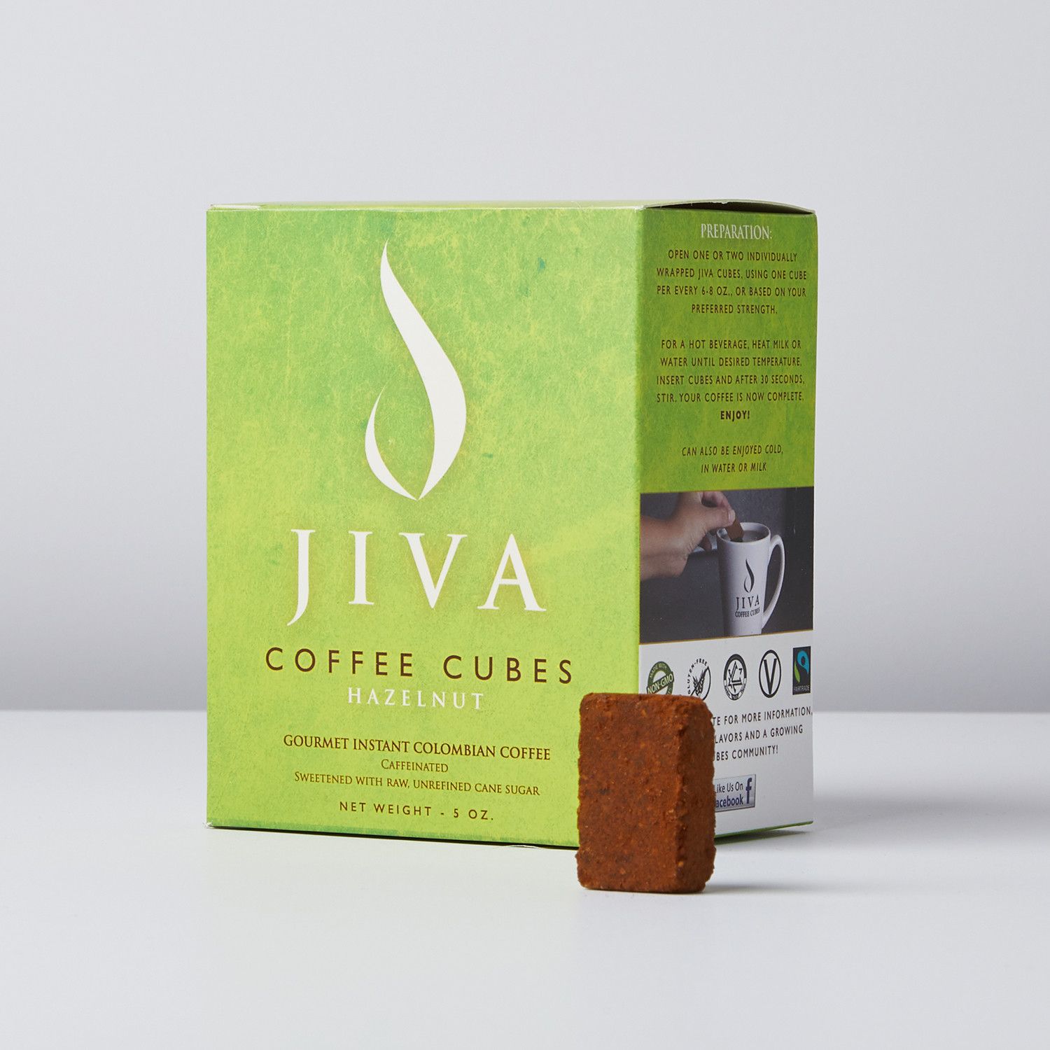 With Jiva Cubes you can have fresh, fantastic coffee absolutely anywhere. Made of compressed Colombian coffee and raw cane sugar, these individually packaged cubes just need to be gently stirred into hot water, and you'll have a cup of gourmet coffee in your hands in just 60 seconds. No lines, no waiting, no cleanup. Every cube is slightly sweetened and flavored with USDA organic hazelnut flavoring for just a touch of that signature Colombian flair, and is gluten free, vegan, non-GMO and Fair Trade certified.