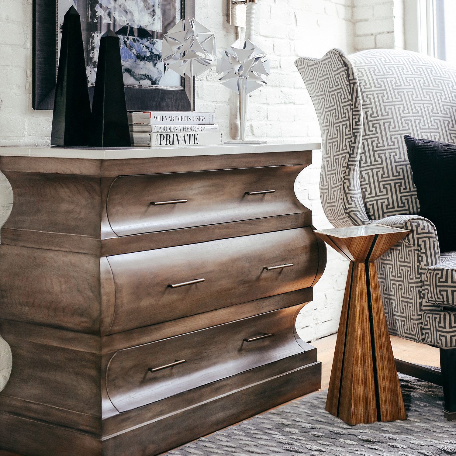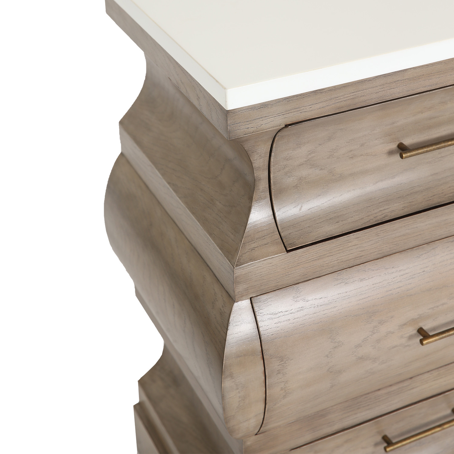 With its shapely silhouette and gray oak finish, Jacob is an updated bombe chest and a dramatic favorite. Topped with a white stone top, this three drawer classic is an easy choice for any transitional interior.