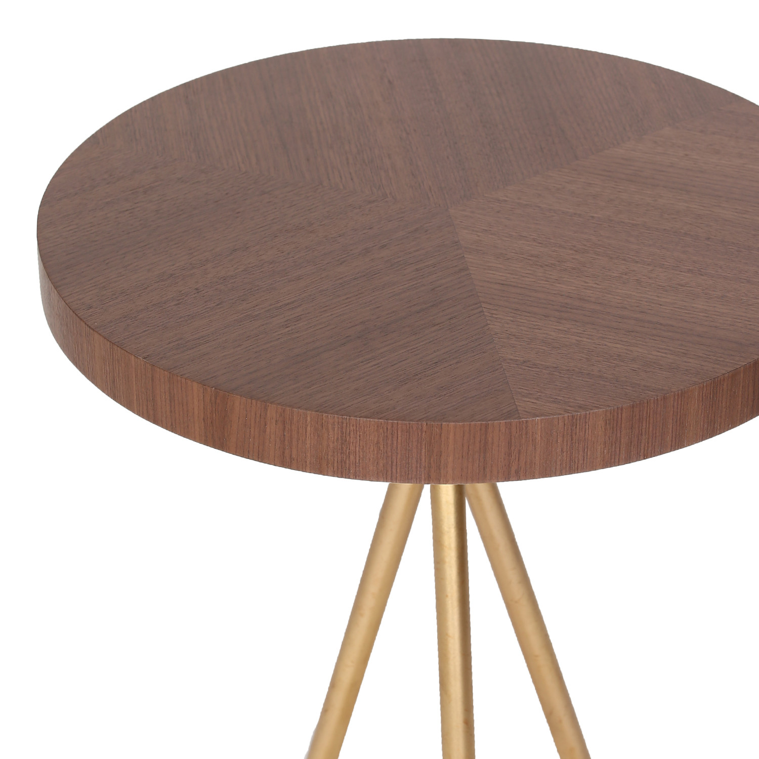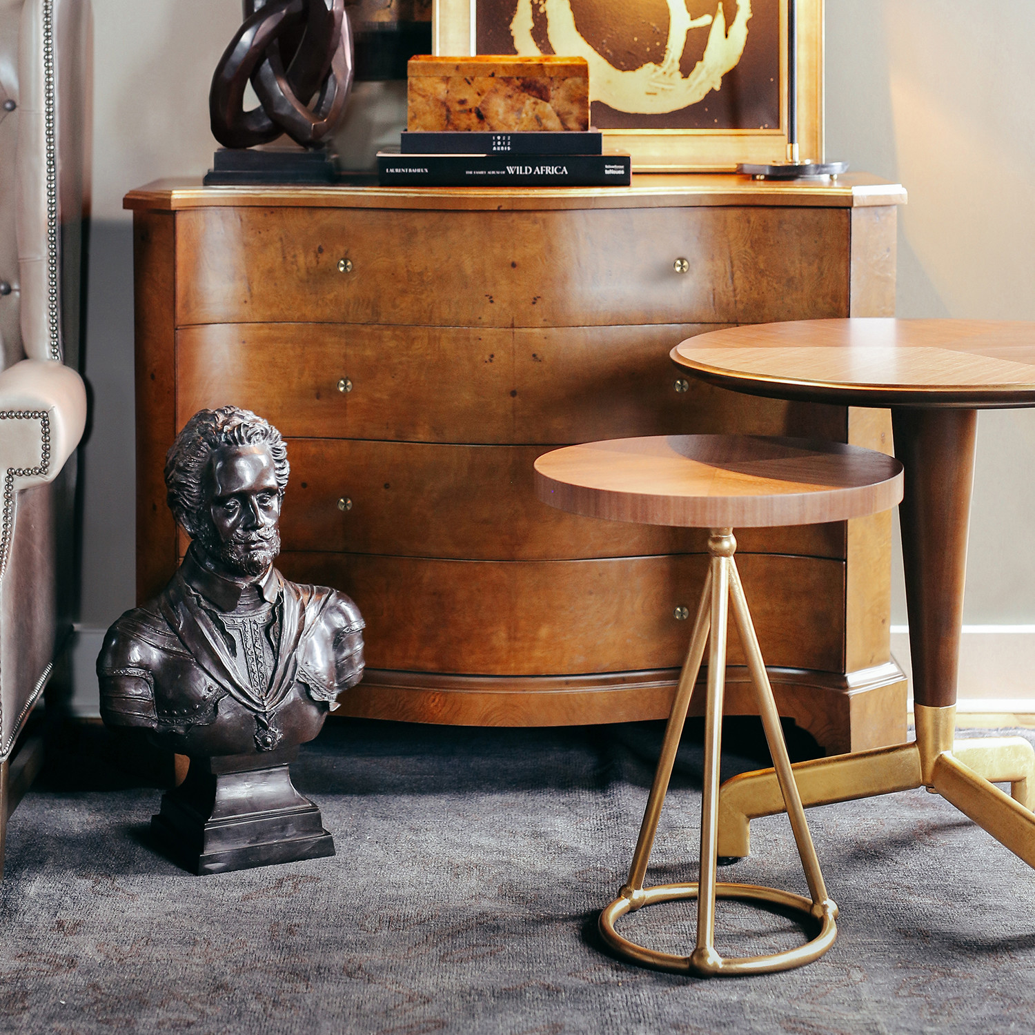 Orson is an elegant and architectural accent table with an “of the moment attitude.” A clean, straight-edged walnut top balances on a geometric gold leaf base. Slight antiquing on the gold leaf allows this lovely side table to live comfortably surrounded by antiques or contemporary furnishings.