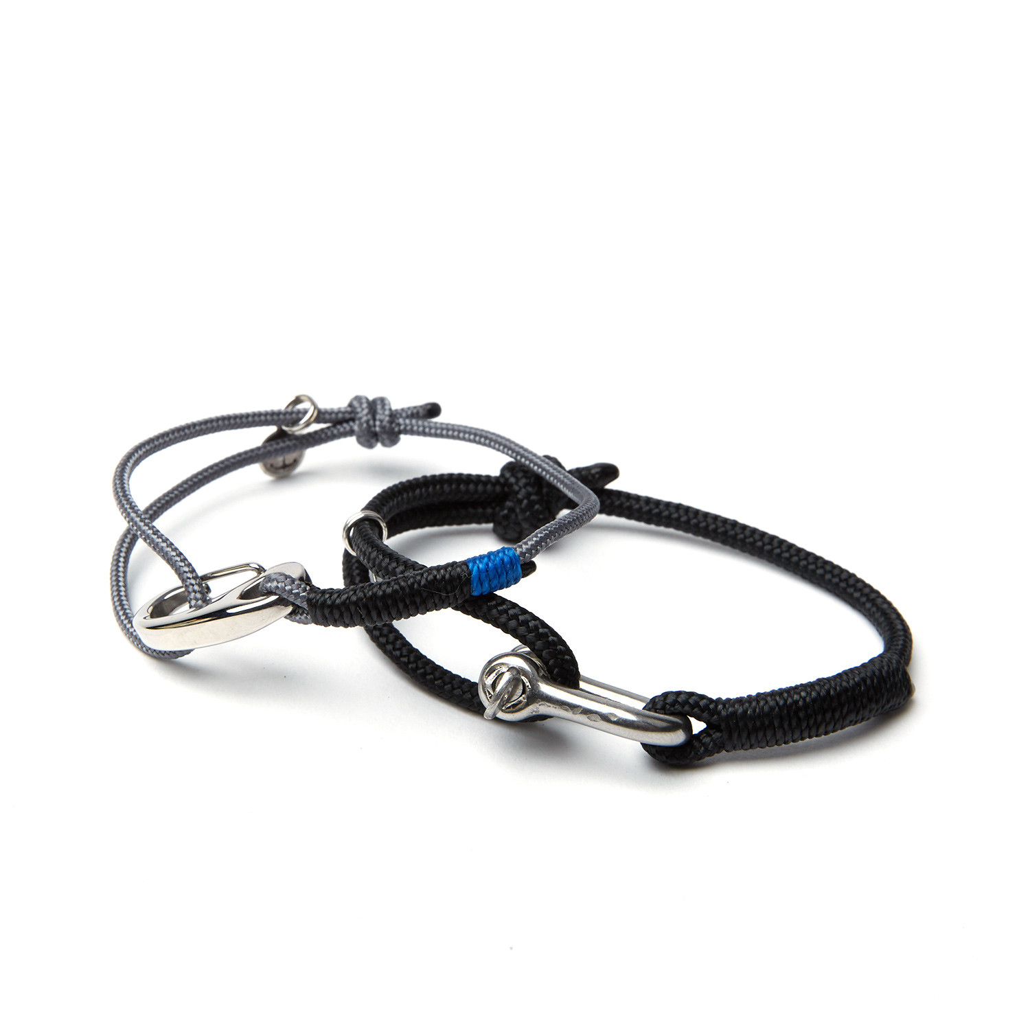 This Nautical Pack combines nautical style with durable detailing. Combining the Stainless Steel D-Shackle Adjustable Cuff in Black and Stainless with the Steel Egg Hook Adjustable Cuff in Black and Graphite, these bracelets combine stainless steel detailing, sailing line, and whipping twine.