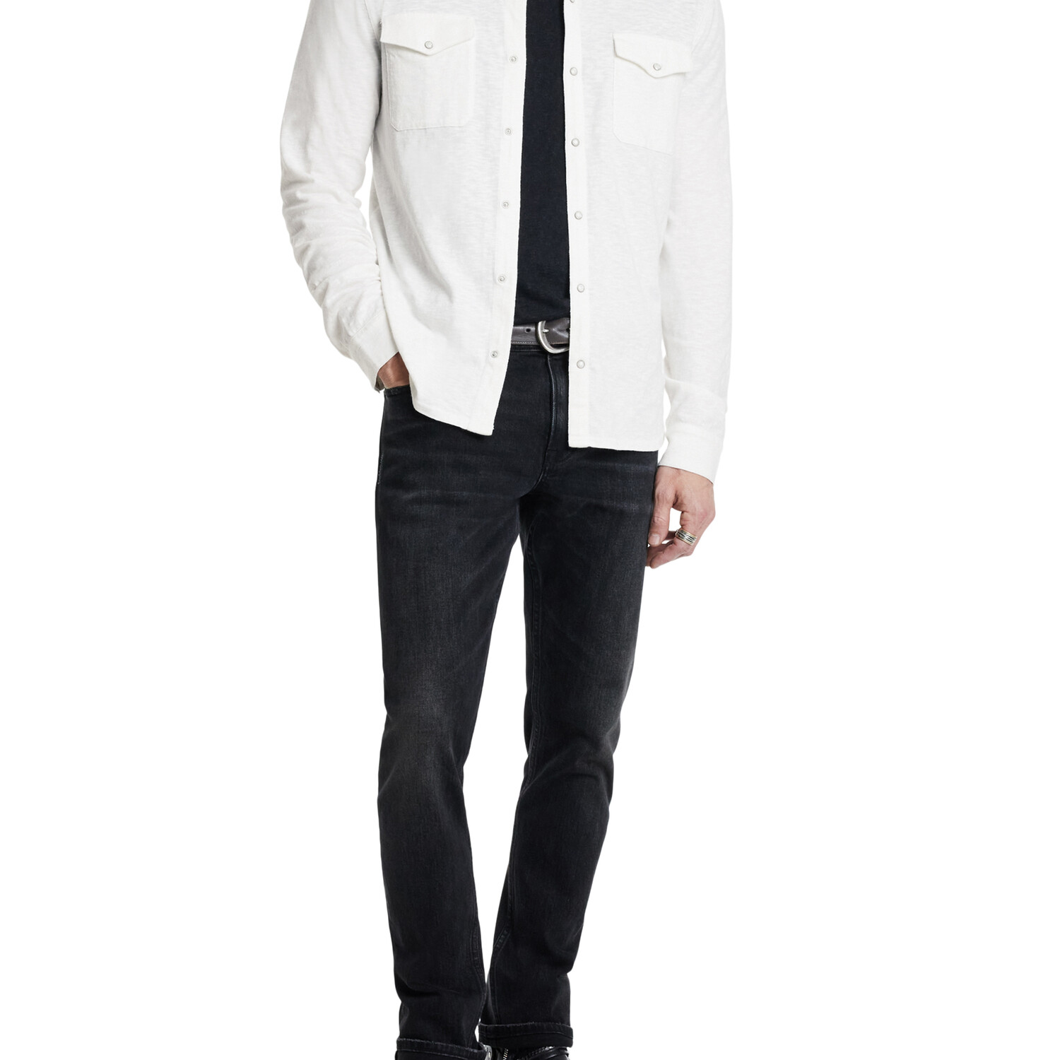 John Varvatos delivers that signature mix of rock-and-roll edge and modern tailoring. Vintage-washed tees, rugged Henleys, and soft suede overshirts balance comfort with understated attitude. Each piece feels broken-in yet refined, built from premium materials with subtle distressing and tonal details that work from day to night — effortlessly cool, unmistakably Varvatos.