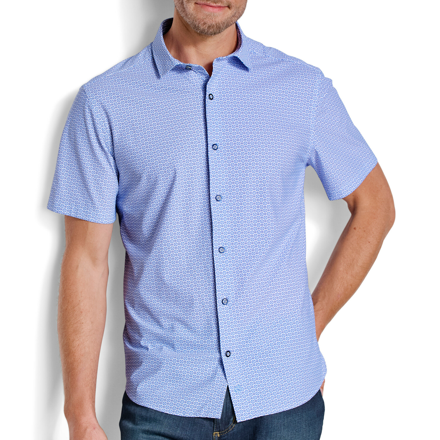 — A short sleeve printed performance knit shirt ready for travel or long days on the go.