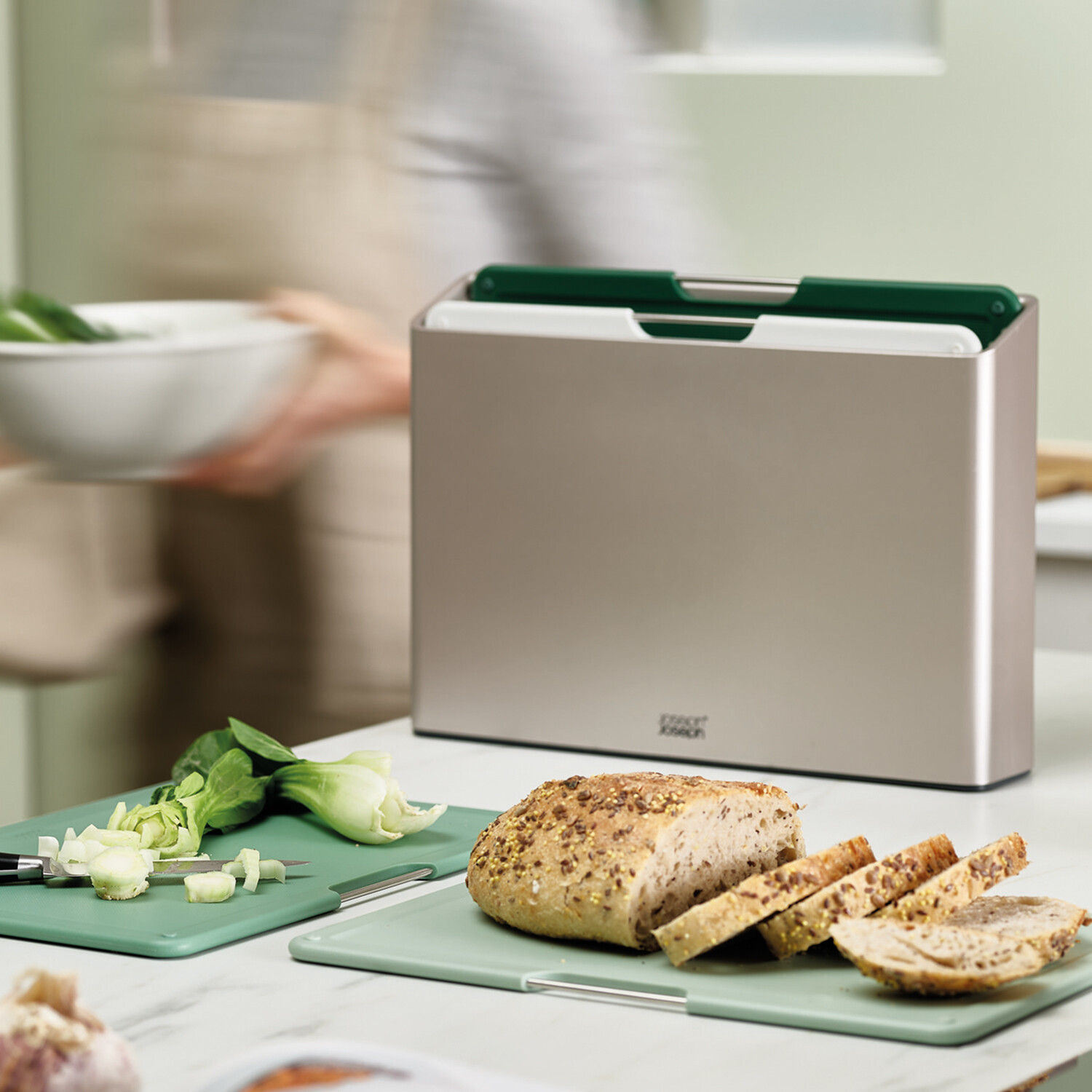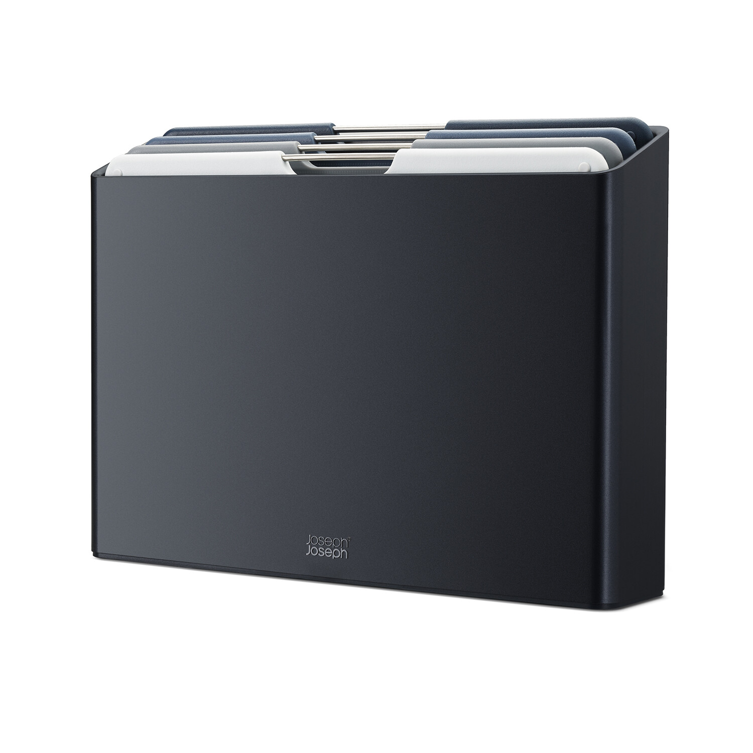 Each board has knife-friendly, textured cutting surfaces on both sides and non-slip feet. The stylish, angled case holds each board neatly apart, allowing air to circulate, and has non-slip feet on the base.