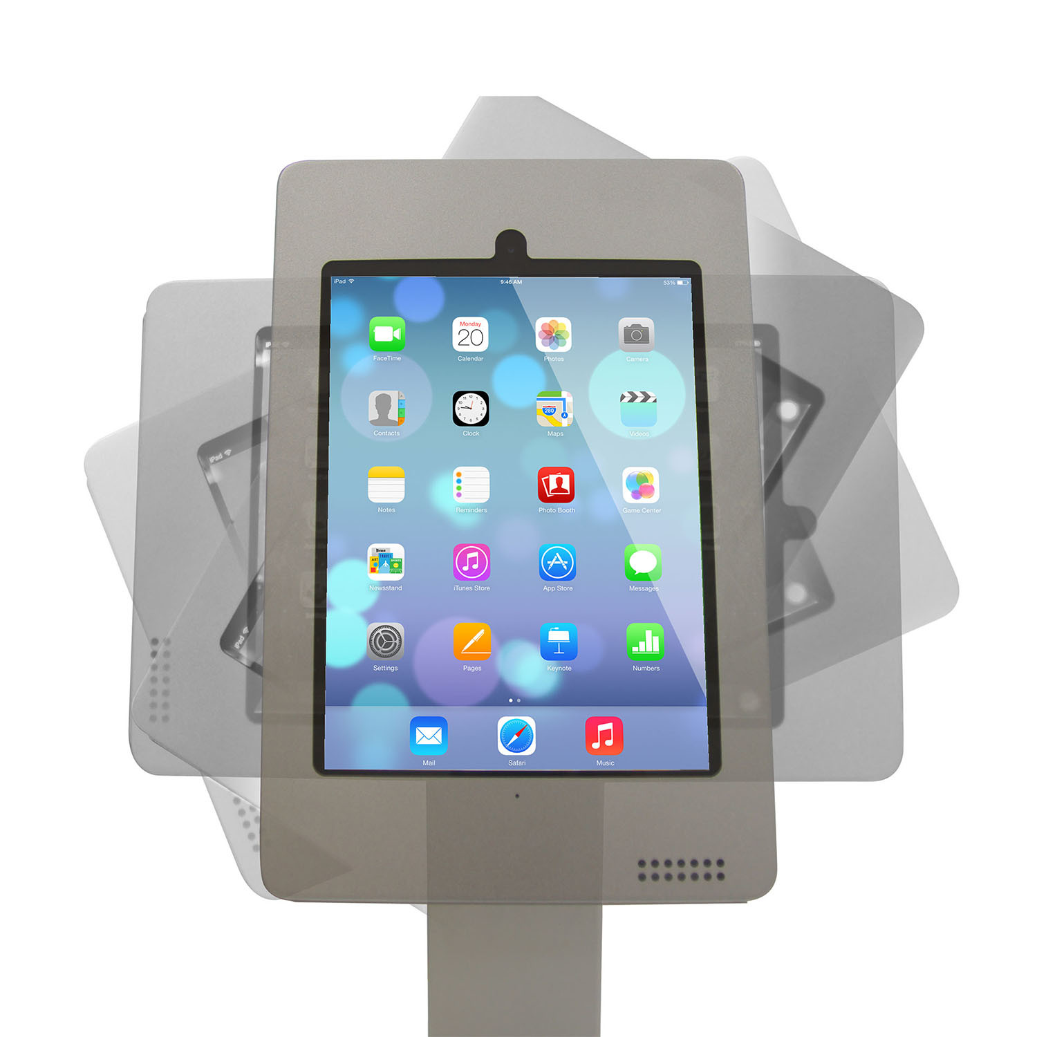 The Elevate Kiosk for iPad is the ultimate commercial solution for tradeshows, museums, and public spaces. The aluminum-alloy construction makes these kiosks lightweight, yet completely sturdy. The Elevate iPad holder rotates easily between portrait and landscape views and allows the user to adjust the kiosk's viewing angle. It also blocks the iPads home button, giving you maximum control over the features and contents your viewers can access. The sleek modern look of the Elevate is designed to complement a variety of applications and settings.
