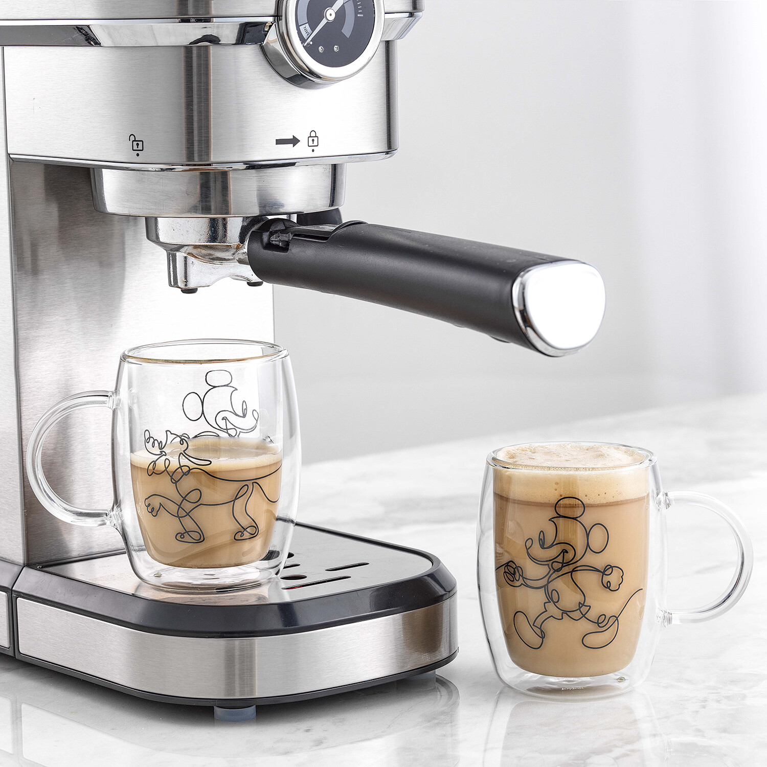 Enjoy your favorite drink with the JoyJolt Aroma Coffee Cups. Perfect for hot or cold beverages, these mugs are made of heat and condensation-resistant borosilicate glass that is stronger and more durable than common glass. The double-walled design suspends beverages within an inner wall for the ultimate insulation—preserving drinks at their ideal temperature while protecting your hands. When not in use, the stackable design keeps them safe while saving you precious cabinet space. Featuring Disney's Mickey Mouse and Pluto, these glasses have a touch of nostalgia that's also fun for kids!