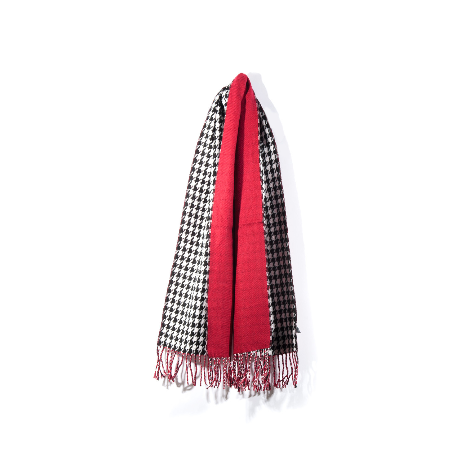 This houndstooth scarf is warm and eye-catching with sharp houndstooth on the front and rich crimson coloration on the reverse. This is a lovely layering piece for chilly winter months when you're looking to be stylish and practical.