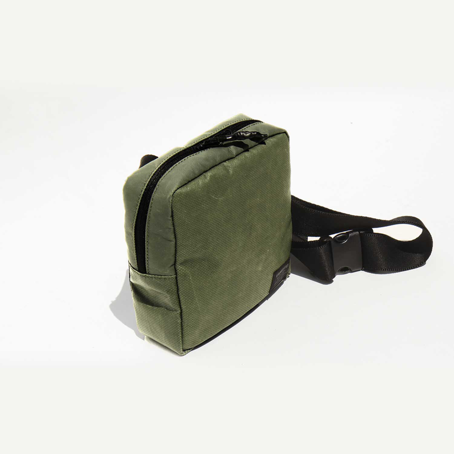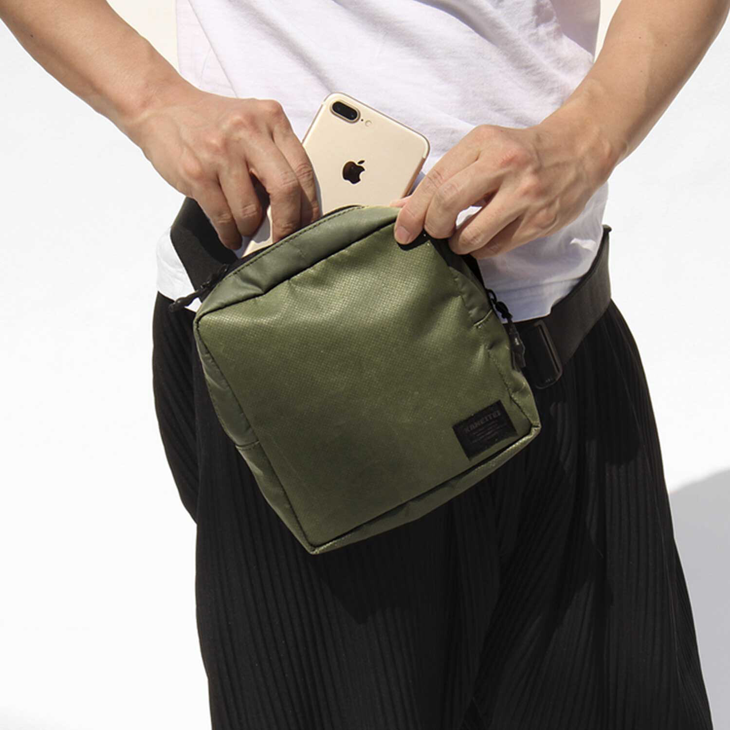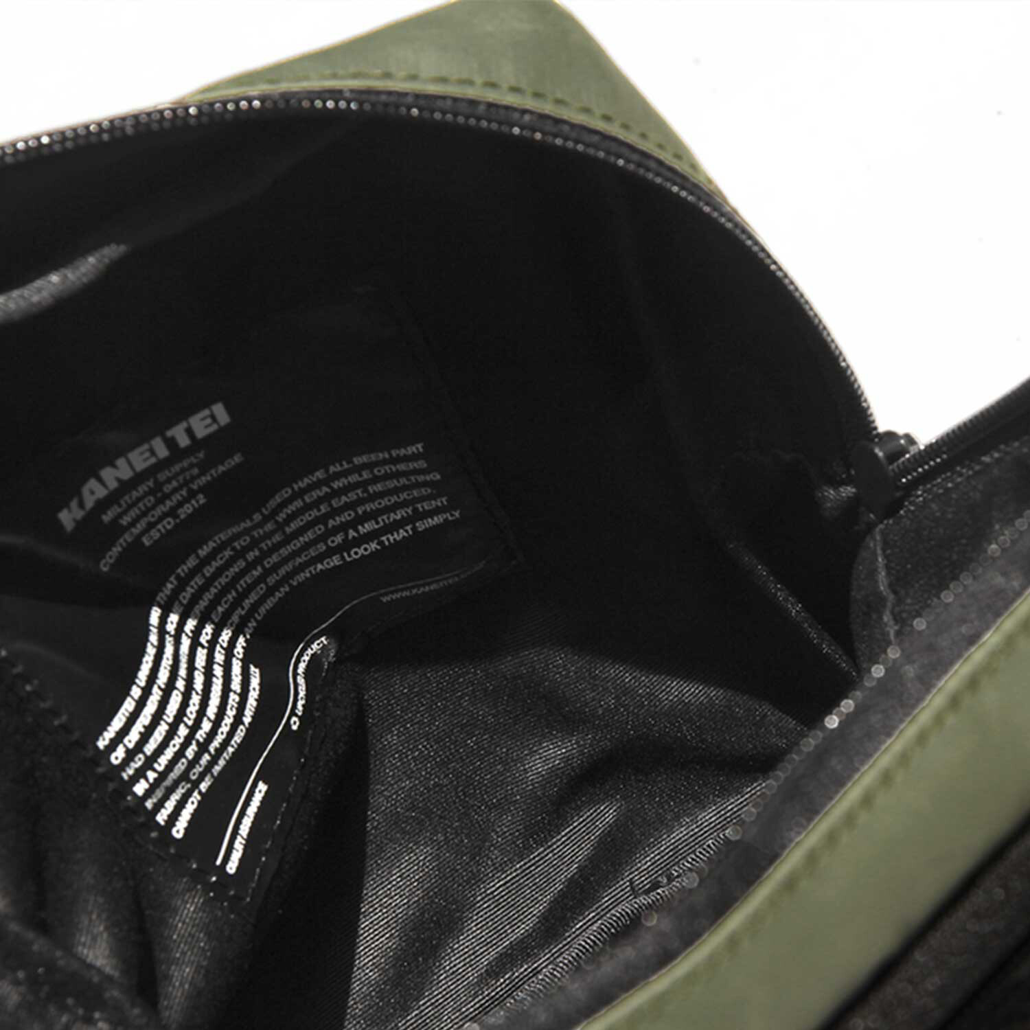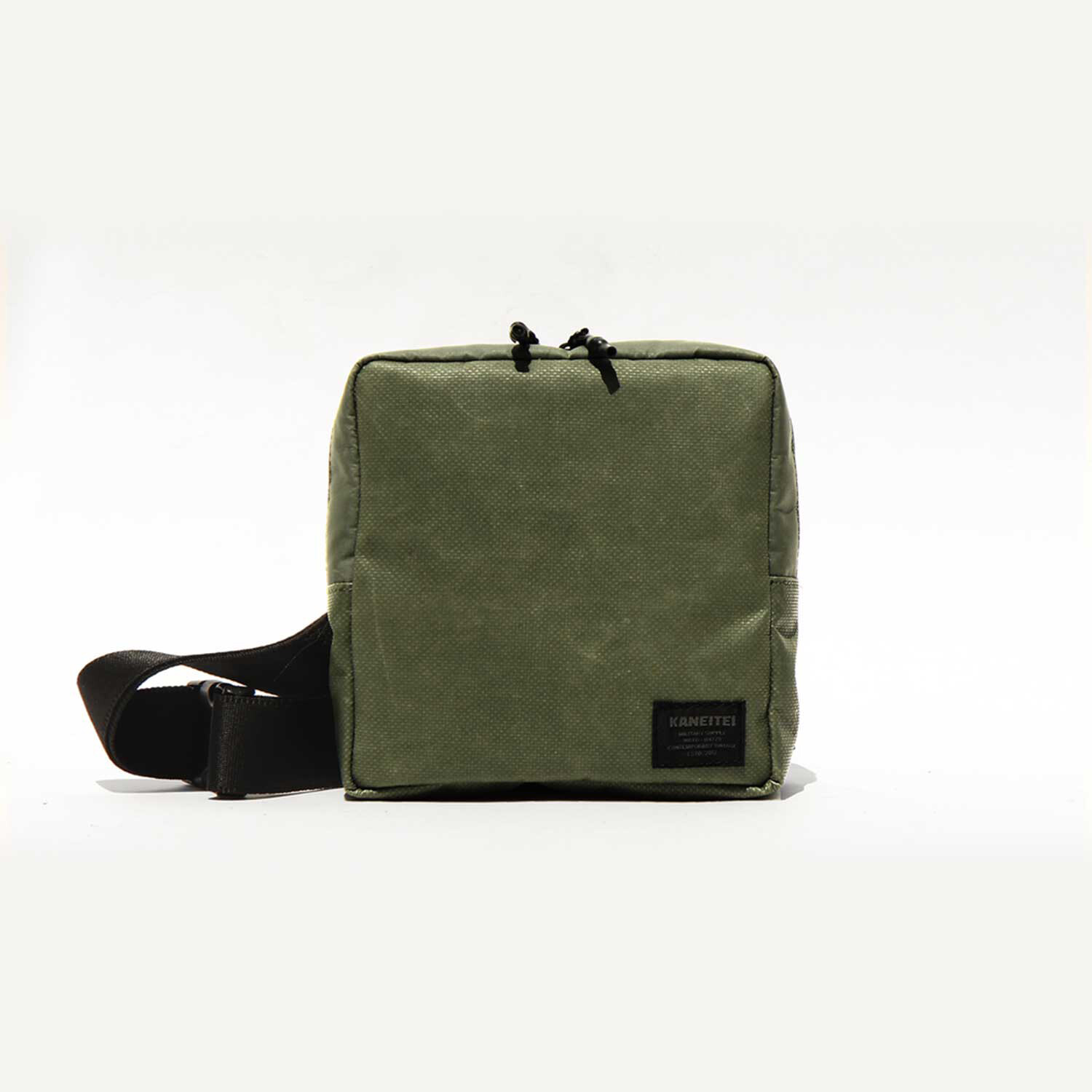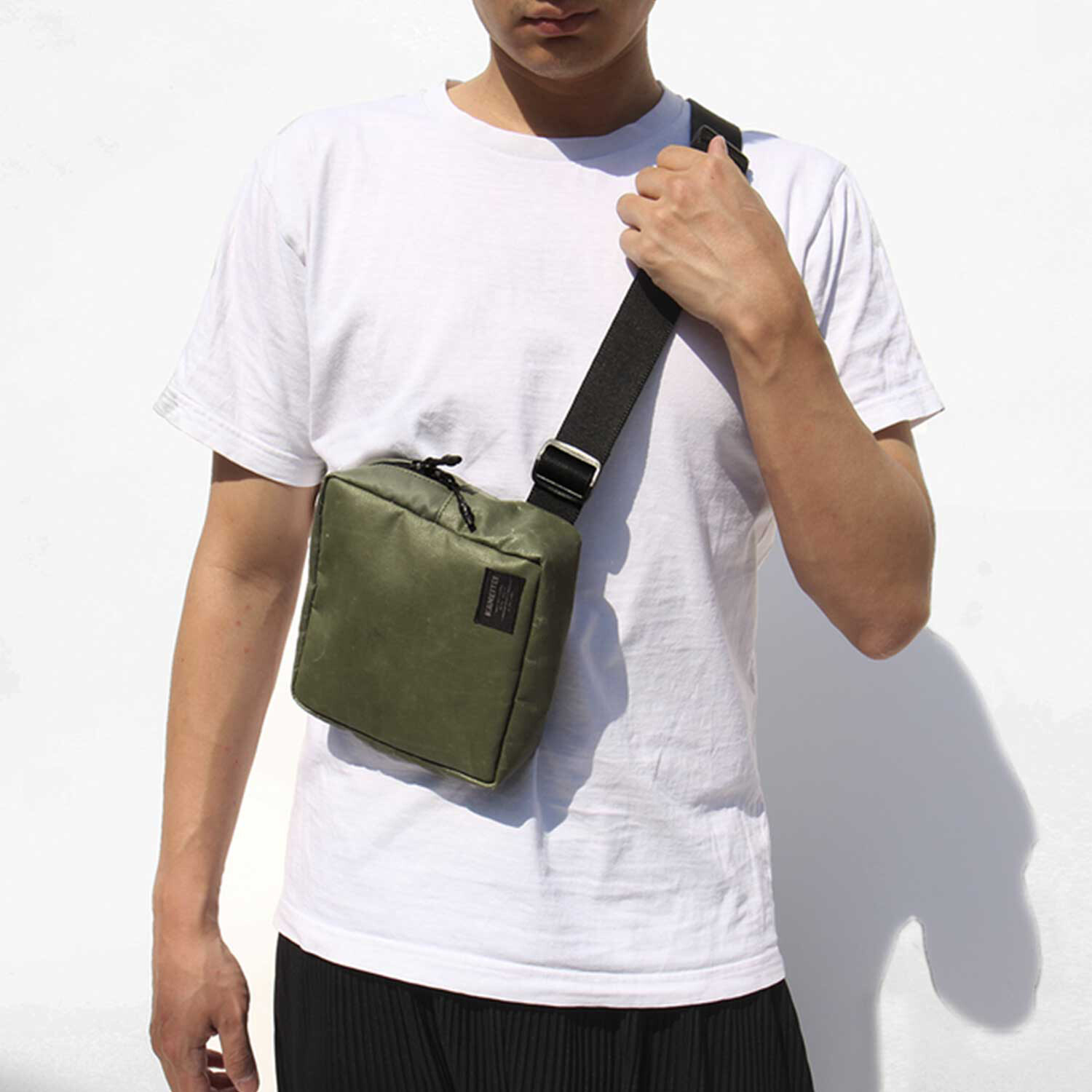 Aki is a square cross body bag made by recycling military tents. You can wear it on your waist or shoulders, and it's easy to use with a double zipper. It has hidden pockets on the back and internal open-pocket, so it can be held in various ways.