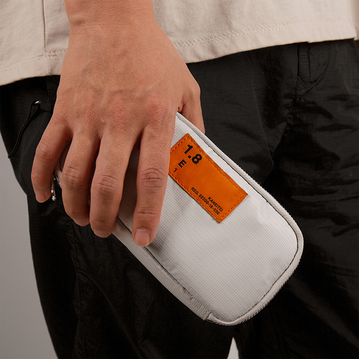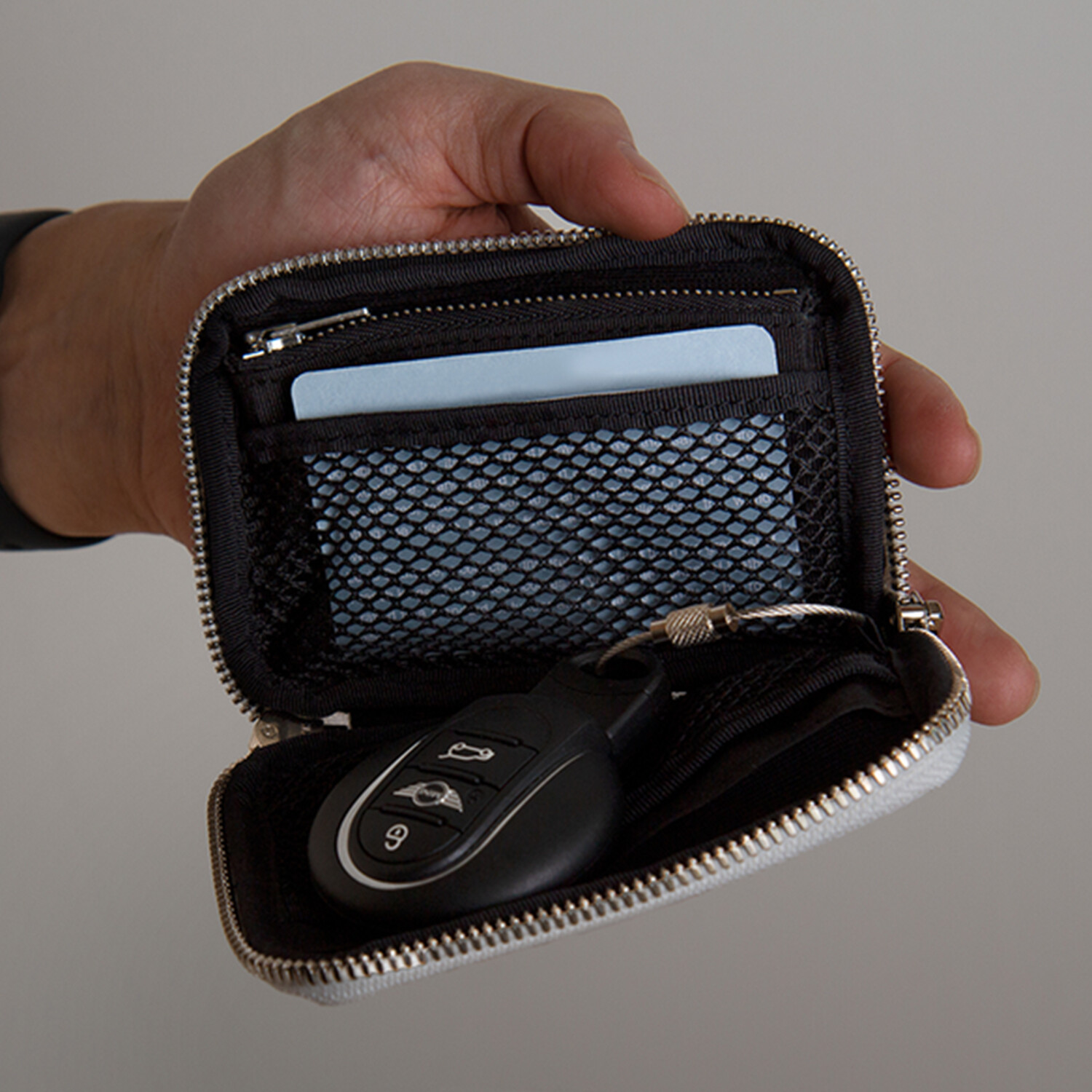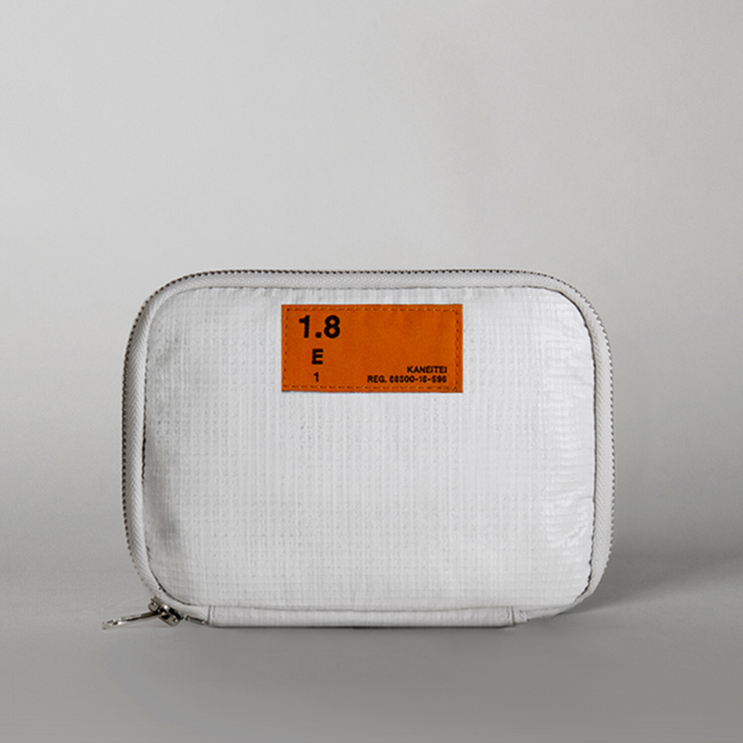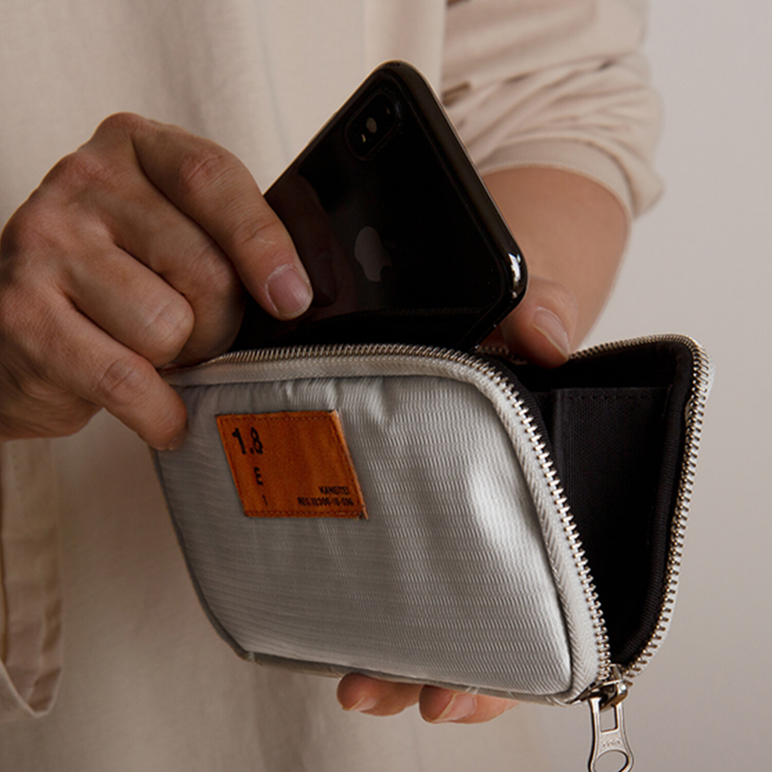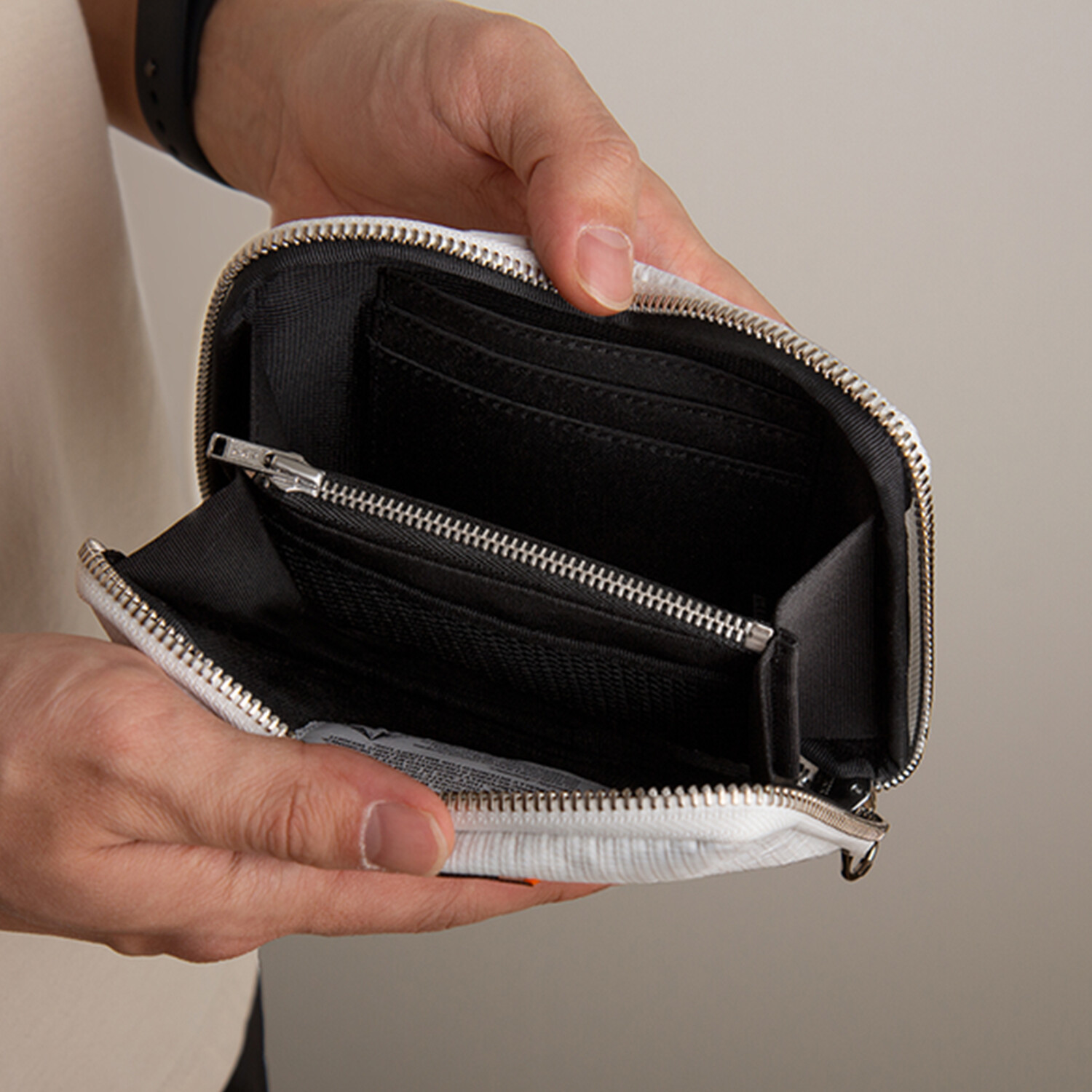 Sei is a handy size card wallet made from recycling vintage military tents. Inside, there is a wire-line keying that can hold small objects. It has a zip-in pocket for coins, and it has several compartments so you can separate cards, bills, and receipts.