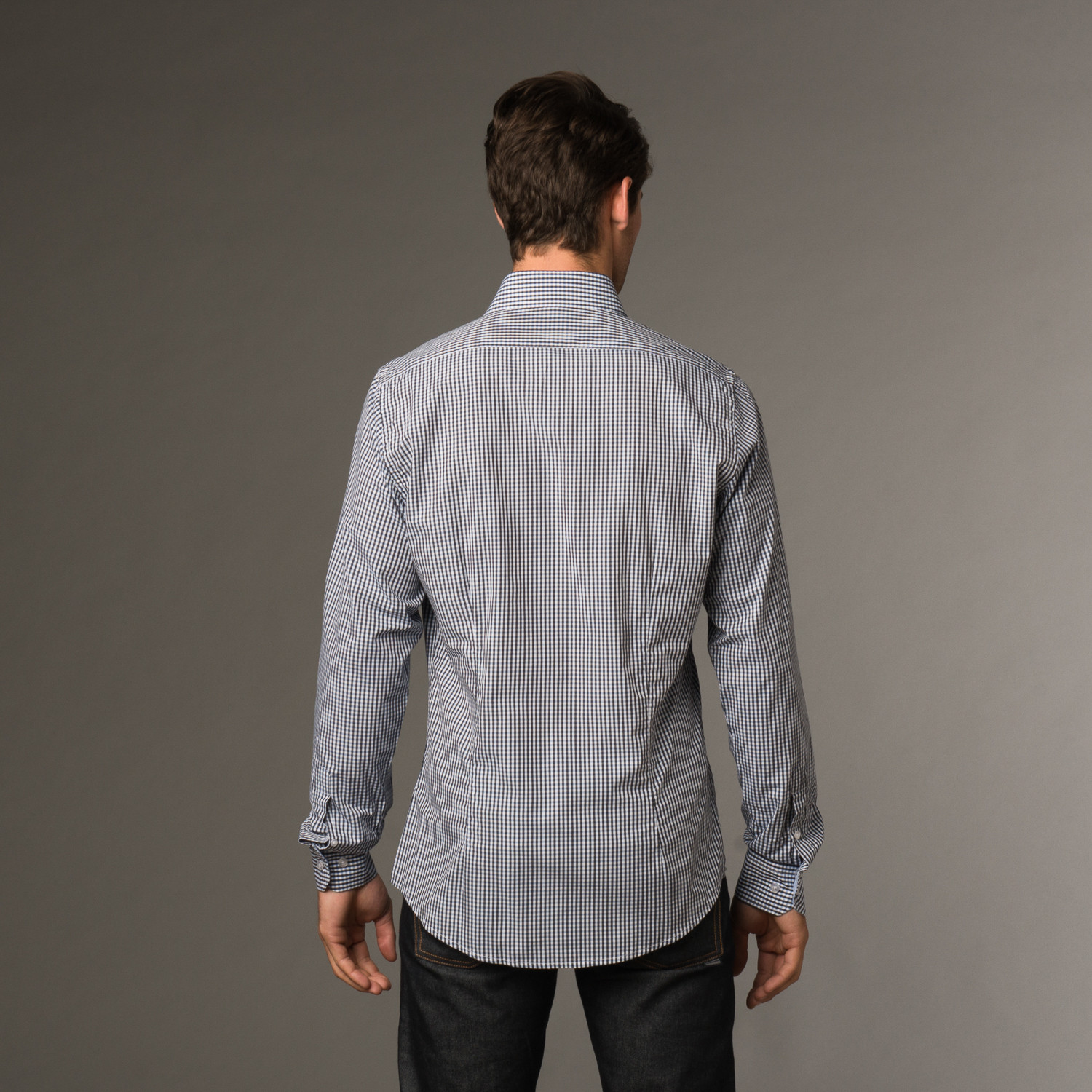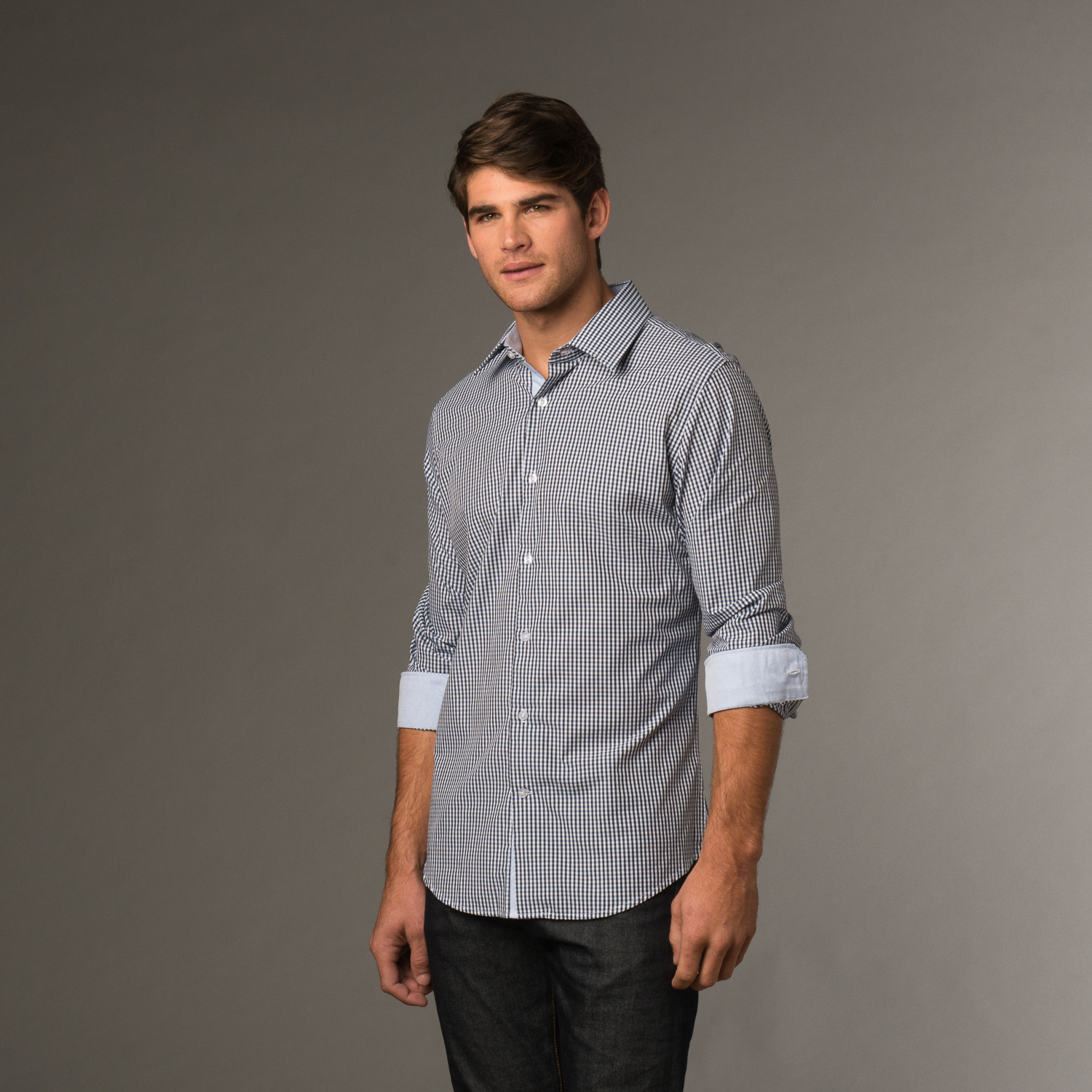 This gorgeous, royal blue check button up has contrast lining on the inner cuffs, inner collar, and button plaque. Darts at the waist, a spread collar, and a curved hem give you that classic, handsome look, and with this Fall-ready, work-appropriate wardrobe addition, you'll be covered no matter what the occasion.