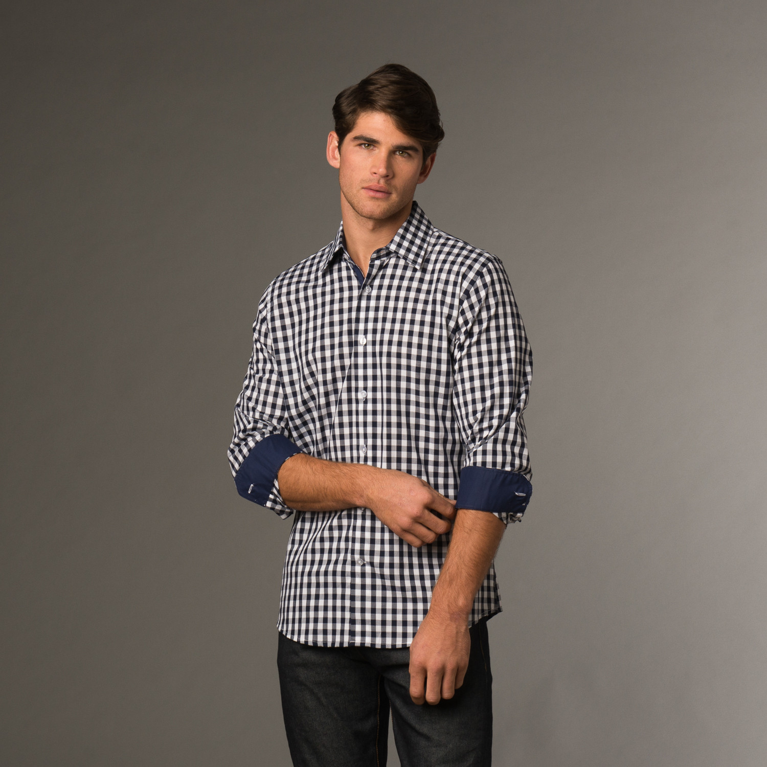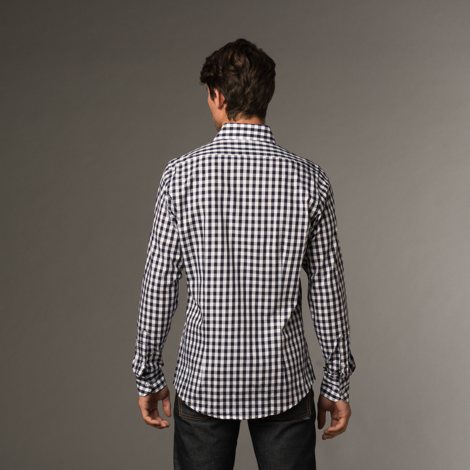 This gorgeous, royal blue and white check button up has contrast lining on the inner cuffs, inner collar, and button plaque. Darts at the waist, a spread collar, and a curved hem give you that classic, handsome look, and with this Fall-ready, work-appropriate wardrobe addition, you'll be covered no matter what the occasion.