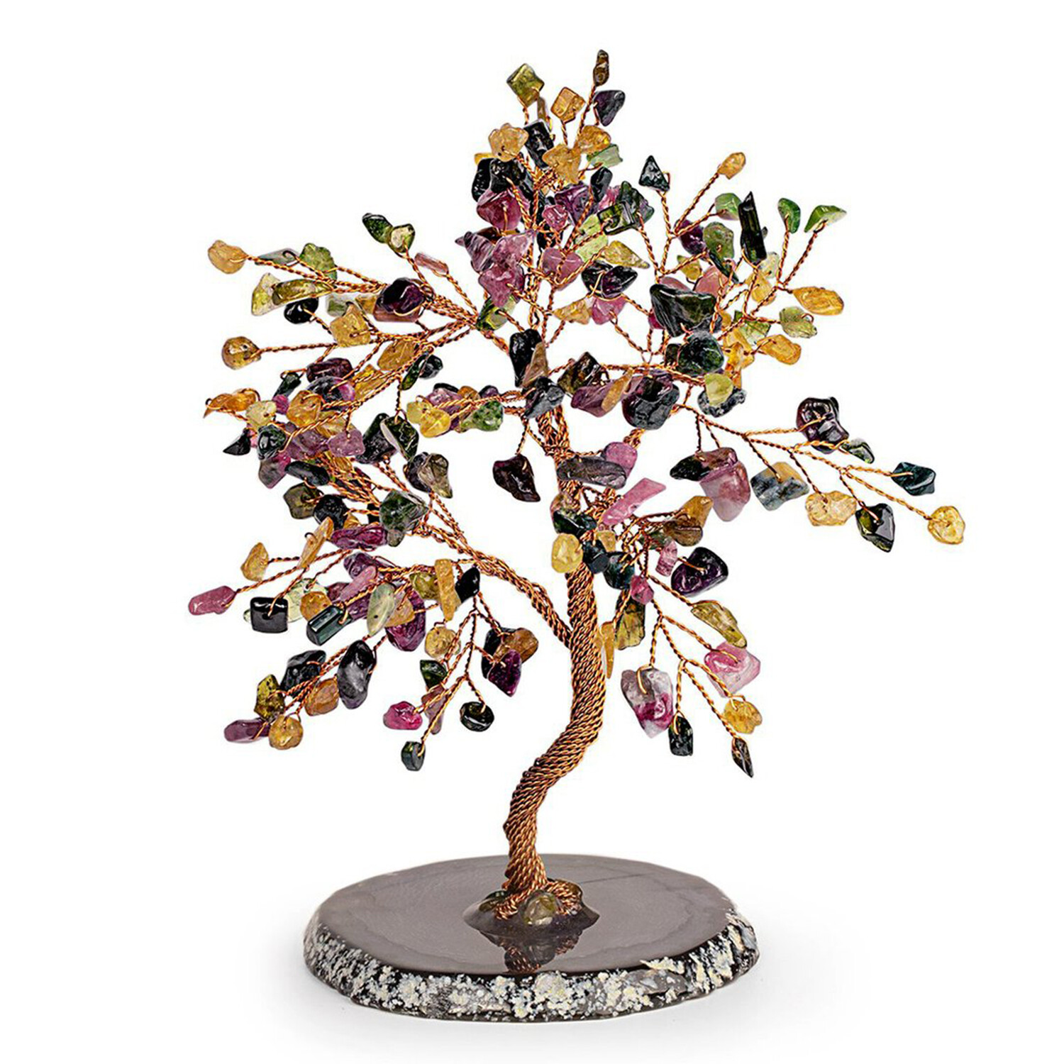 Positive emotions improve your life. Attract only the things that serve you with the Tourmaline Gemstone Tree. A symbol of unconditional love, this artisan tree is blossoming with precious tourmaline leaves hand-wrapped in copper wire and set atop an agate base.