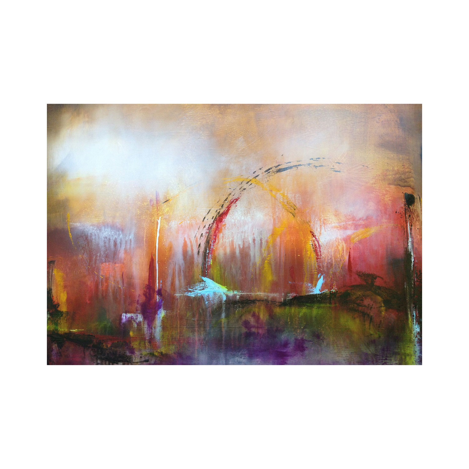 Like a ferris wheel or a celebratory firework, the eye flow of this painting follows an upward arch out of a sea of muddier colors. Whatever the intended communication, the end result is a dramatic one, inviting the casual viewer to take a closer look and perhaps even venture their own interpretations.