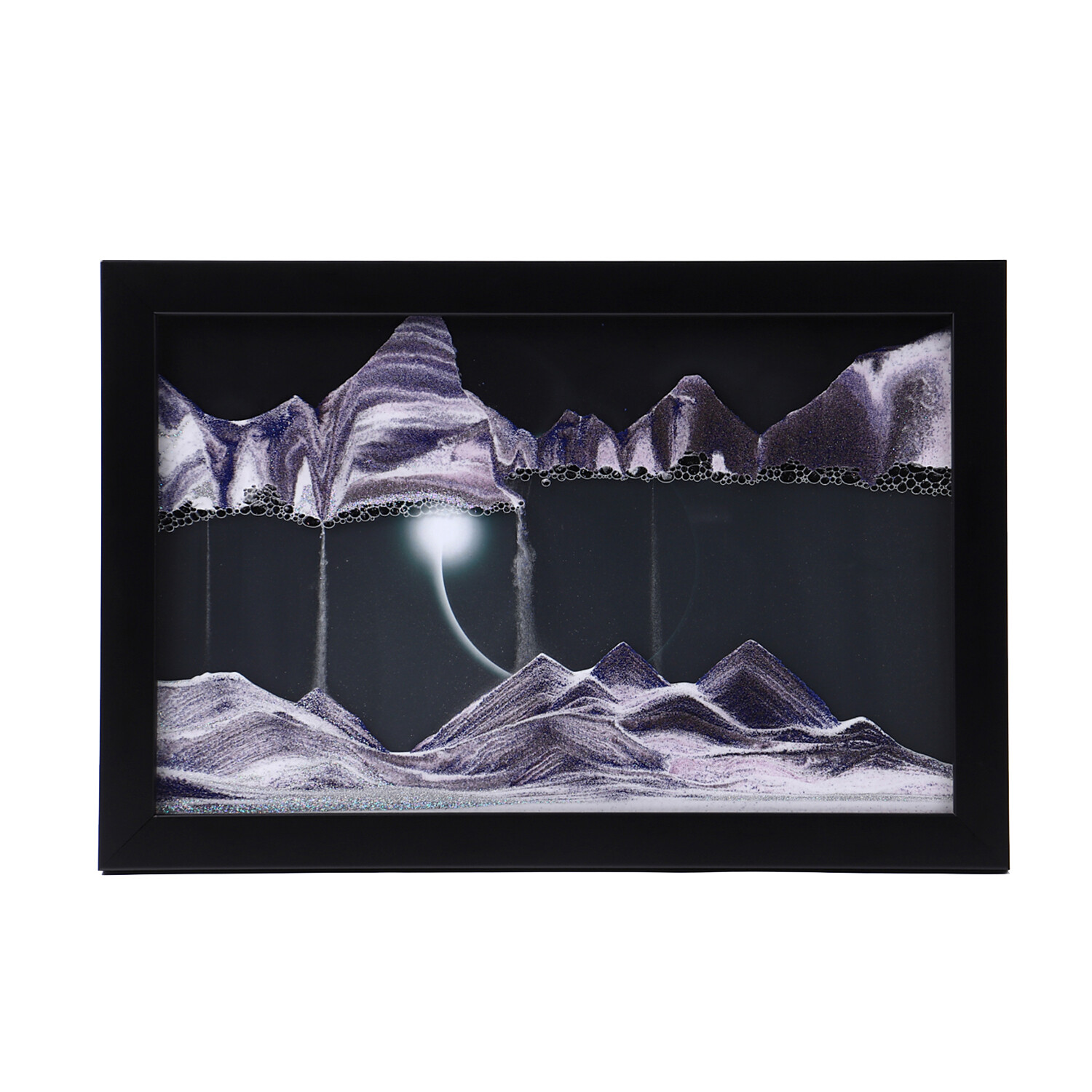 The Sand blend is a striking combination of Ruby, Ash, White, Blue, and Silver Glitter. This sand fusion will have your imagination hopping on a spaceship to vacation. Hang the Movie on your wall (all hardware included), and much like a motion picture, watch it create a new scene with every turn. This size of movie makes great wall art but can also be put on a table (basic table stand included). Flow Time: 20 min- 2 Hours With this versatile ever-changing sand picture, The Diamond Ring Movie is sure to wow you and inspire serenity for countless hours. If you are giving this as a gift, its one that they will talk about for years to come! Your Diamond Ring Movie Moving Sand Art will do several times a day what mother earth takes millions of years to accomplish.