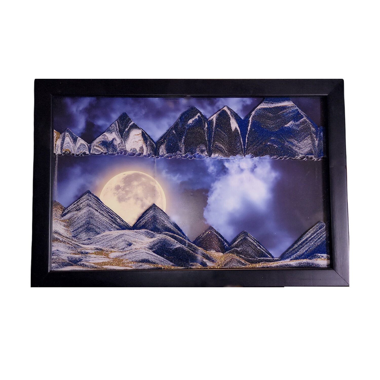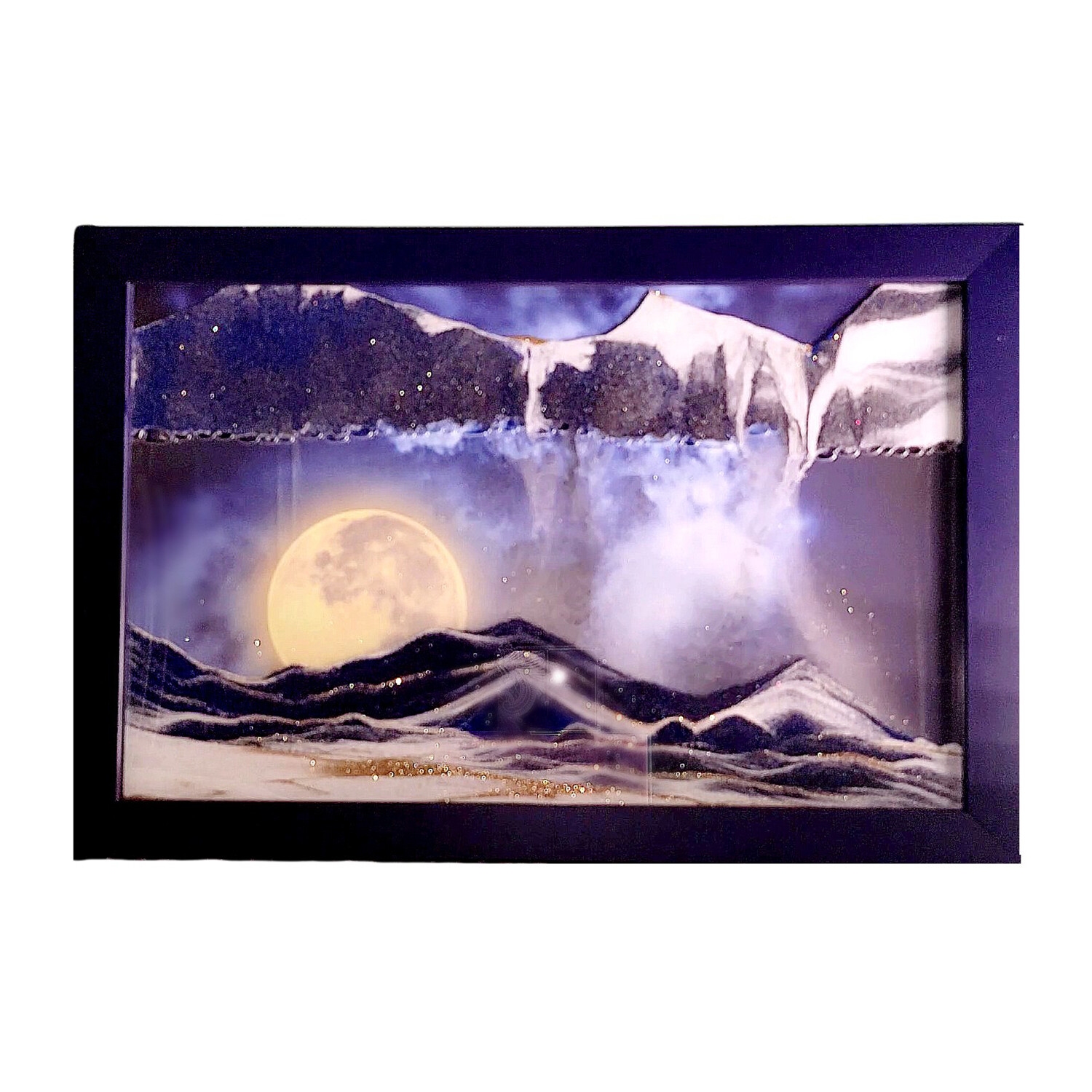 The KB Collection Harvest Moon captures the essence of magic that occurs on the night of a full moon. The Harvest Moon movie is a majestic addition to our wall mountable series which is enhanced with the extra dimension of a background image. The frame is a midnight blue lacquered beechwood, paired with a bold dazzling sand blend containing white, midnight blue, indigo, ash, and powerful gold glitter. This sand fusion will have you howling for the moon. Hang the Harvest moon Movie on your wall (all hardware included), and much like a motion picture, watch it create a new scene with every turn. Due to the handcrafted nature of each item, each piece bears its own unique qualities.