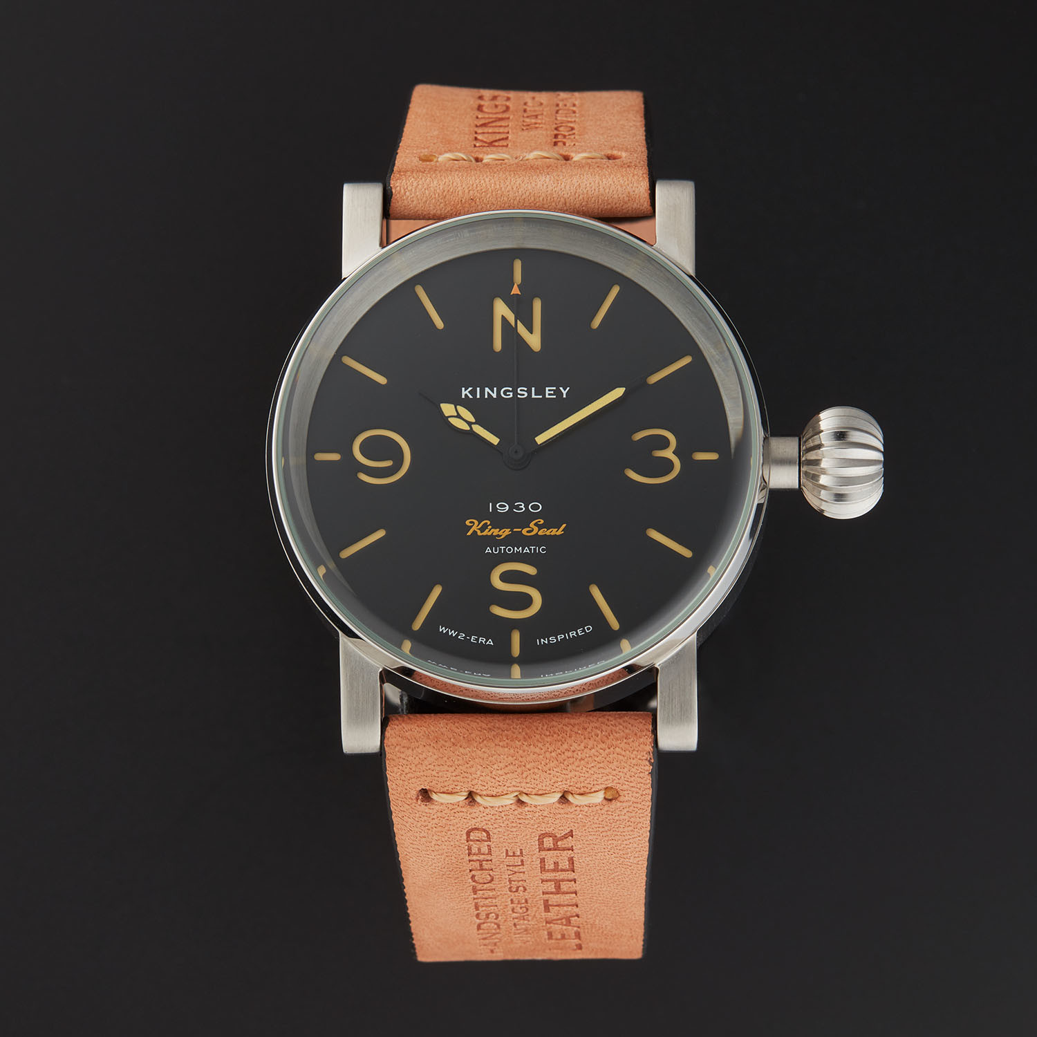 The King-Seal Automatic is an exclusive 1930s era design inspired by trench watches that came into use by the military during WW1. Traditional pocket watches were not practical for combat, so this style was designed to feel like a wrist mounted pocket watch on a leather bomber strap. It features a vintage style bezel that has a raised green edge glass with an extended crown inspired by pocket watches of the 1930s.