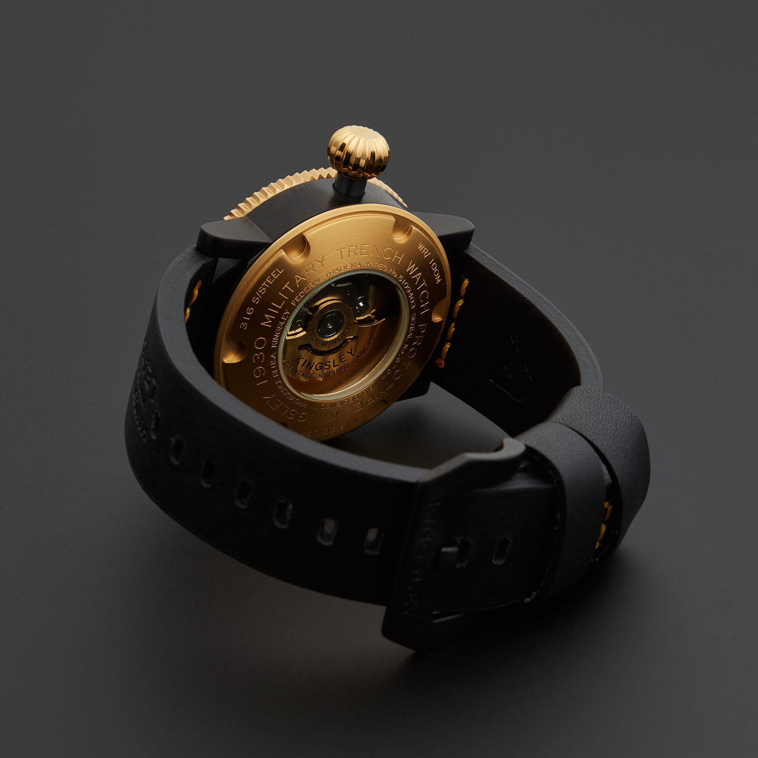 The King-Seal Automatic is an exclusive 1930s era design inspired by trench watches that came into use by the military during WW1. Traditional pocket watches were not practical for combat, so this style was designed to feel like a wrist mounted pocket watch on a leather bomber strap. It features a vintage style bezel that has a raised green edge glass with an extended crown inspired by pocket watches of the 1930s.