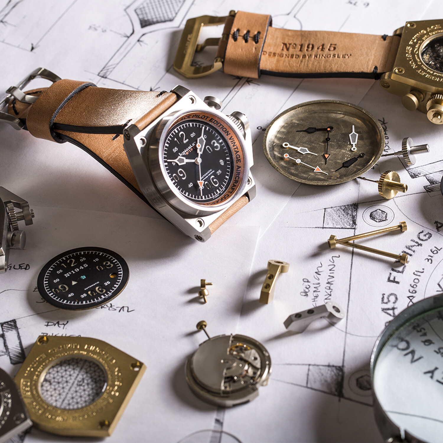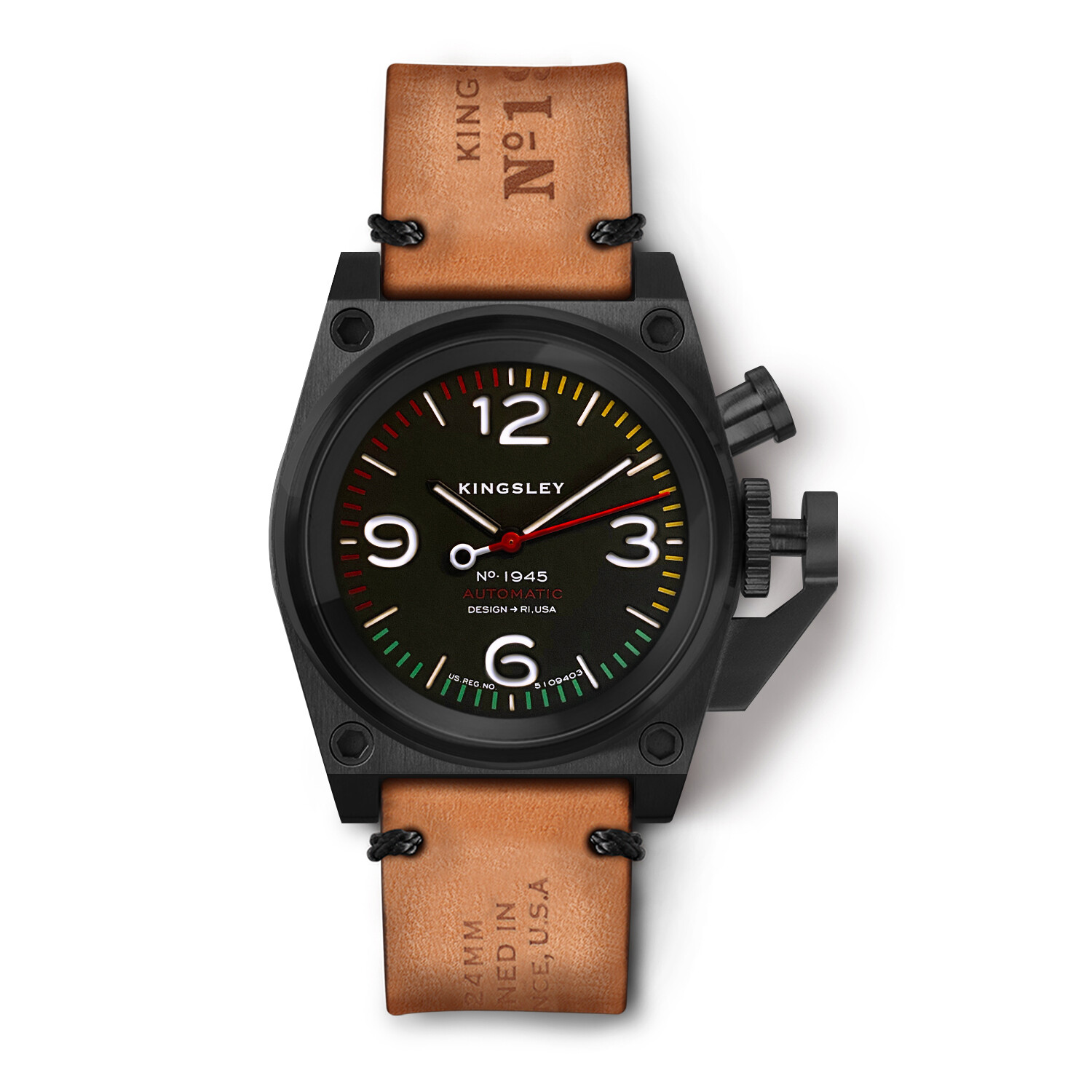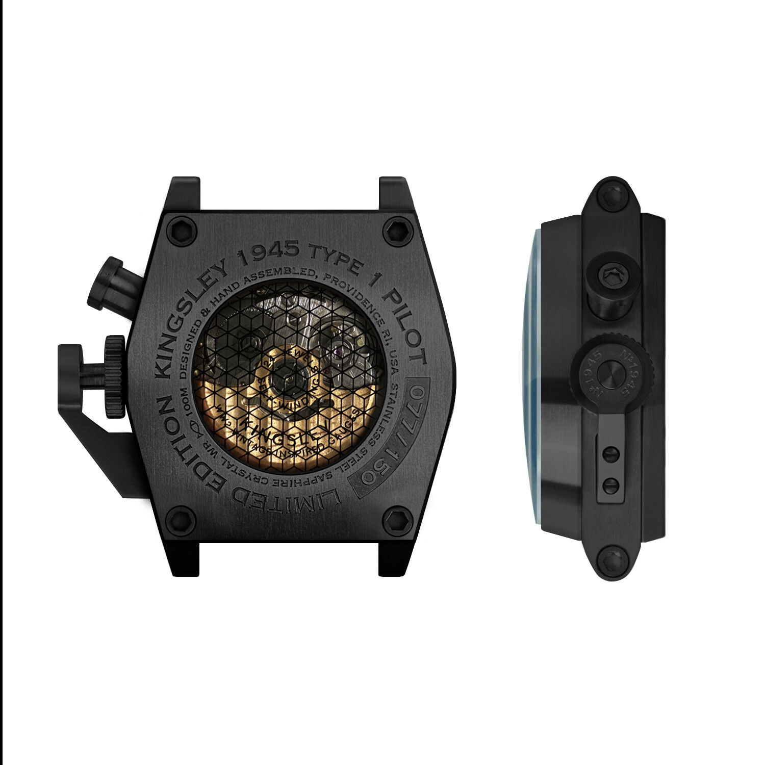 Inspired by the 1940s WW2-era fighter plane gauges and grenades, the Kingsley Type 1 Automatic is an exclusive limited edition vintage-inspired timepiece. Machined out of 316 stainless steel, the Type 1 features the iconic square and round hex bolted case similar to that of a cockpit gauge. It has a distinctive crown guard styled after a 1940's MK2 hand grenade lever. Designed, engineered, and assembled in Providence, RI, the Type 1 is powered by a 24 Jewel Seiko Automatic movement customized with unique vintaged-inspired Cotes De Geneve engraved parts, and individually numbered.